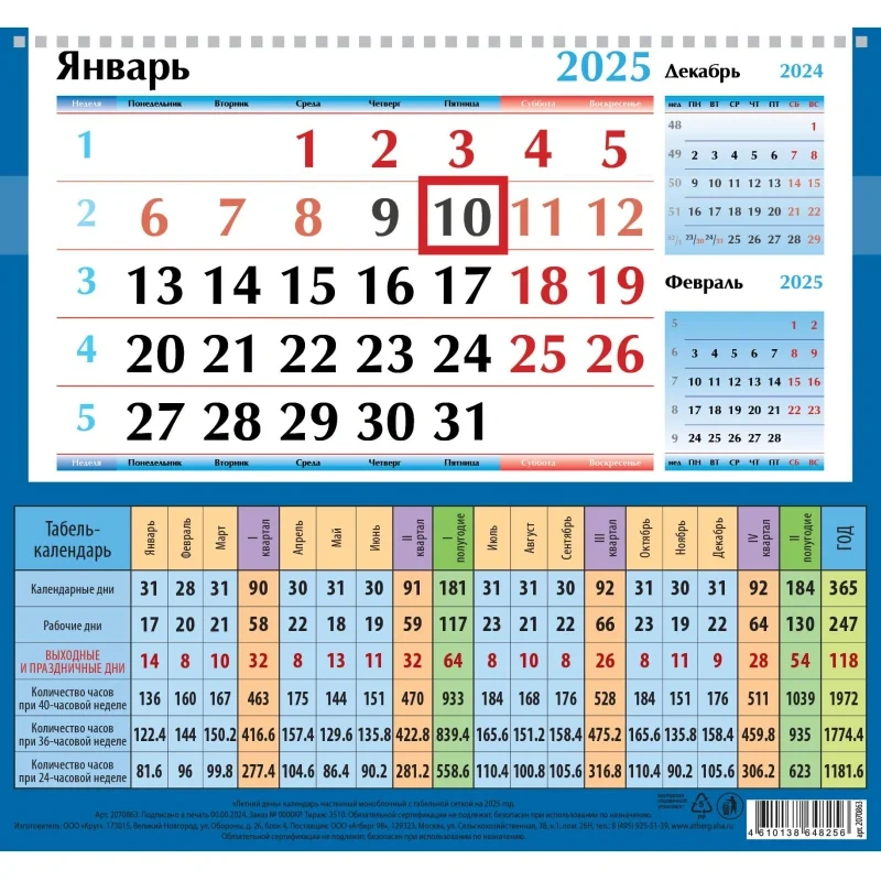 Календарь настенный моноблочный с табелем,2025,Летн. день,офс,1спир,310х500 Календарь настенный моноблочный Летний день на 2025 год. Календарь моноблочный с производственным табелем и курсором, формат в разложенном виде 310x500 мм. Предназначен для использования работниками бухгалтерий и отдела кадров. Состоит из верхнего топ-слайда (мелованный картон плотностью 230 г/м2, покрытого глянцевым УФ-лаком, формат 310x210 мм), блока из офсетной бумаги плотностью 70 г/м2 (формат 290x160 мм) и подложки (мелованный картон плотностью 230 г/м2, формат 310x290 мм). На блоке - календарная сетка на текущий месяц с нумерацией недель, а также (в меньшем формате) - на предыдущий и последующий месяцы. На подложке - таблица с табельной сеткой, в которой указаны рабочие и выходные дни, количество рабочих часов при 36- и 40-часовой неделе и т.п. Календарь скреплен одним металлическим гребнем, вешается на стену при помощи кольца (люверса). Упакован в европакет с подвесом.