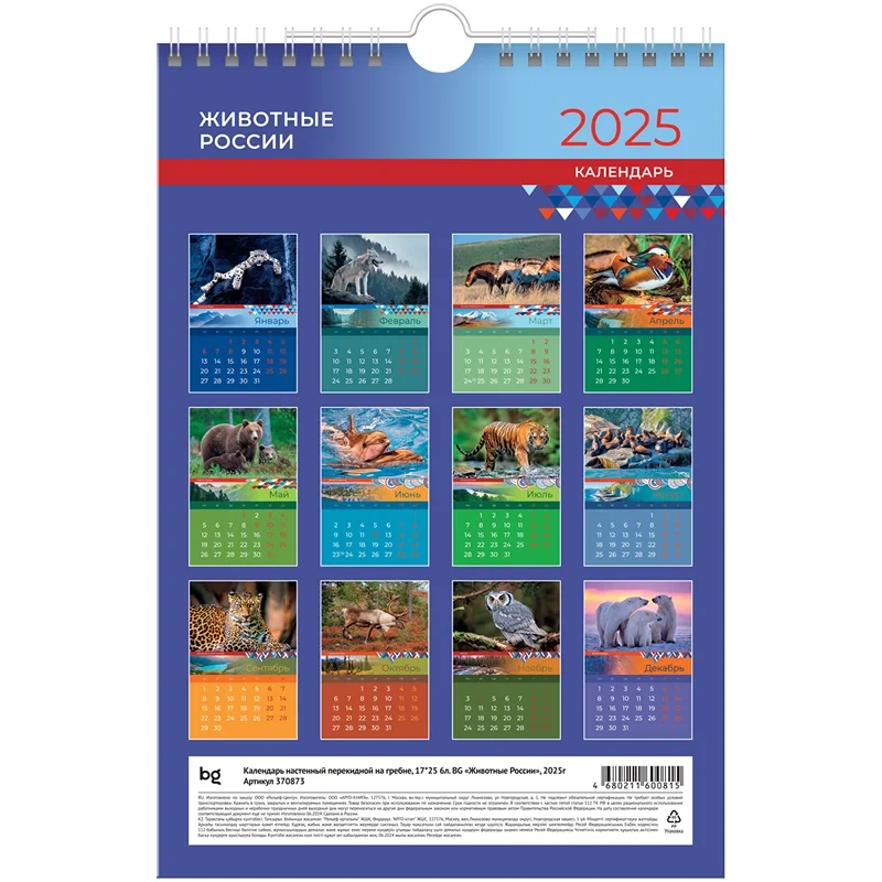 Календарь настенный перекидной на гребне, 17*25 6л. BG 'Животные России', 2025г.