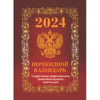 Календарь настол,перек,2024, Гос.симв.Вид1(бордо),офс,4кр,100х140,НПК-41-24 Настольный перекидной календарь на 2024 год, 4-красочный, на офсетной бумаге, формат 100х140 мм, в индивидуальной упаковке (термопленка). Количество страниц: 320. Расстояние от края до верхнего прокола - 18 мм. Расстояние между проколами - 40 мм. Блок: бумага офсетная плотностью 60 г/м2. Печать блока в четыре краски. Обложка: бумага мелованная плотностью 170 г/м2. Печать обложки в четыре краски. Отделка обложки - золотая фольга. В календаре отмечены государственные, профессиональные, православные праздники, памятные даты.