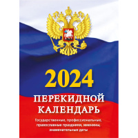 Календарь настол,перек,2024,Госуд.символика,газ,1 кр,105х140, НПК-11-24 Настольный перекидной календарь на 2024 год, 1-красочный, на газетной бумаге, формат 100х140 мм, в индивидуальной упаковке (термопленка). Количество страниц: 320. Расстояние от края до верхнего прокола - 18 мм. Расстояние между проколами - 40 мм. Блок: бумага газетная плотностью 48 г/м2. Печать блока в две краски. Обложка: бумага мелованная плотностью 170 г/м2. Печать обложки в четыре краски. В календаре отмечены государственные, профессиональные, православные праздники, именины, знаменательные даты.