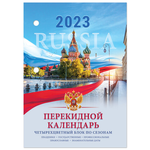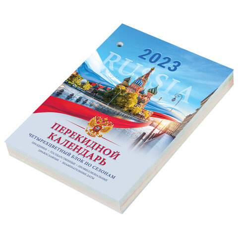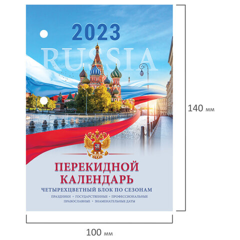 Блок календаря на 2023 год напечатан на офсетной бумаге плотностью 60 г/м2 в четыре краски с выделением цветом выходных и праздничных дней. Справочная информация на 160 листах: календарь на текущий месяц, часы восхода и захода солнца, долгота дня, лунный календарь, праздники. Имеет государственную тематику. Вертикальное расположение. Размер - 10х14 см. Поставляется в индивидуальной упаковке.