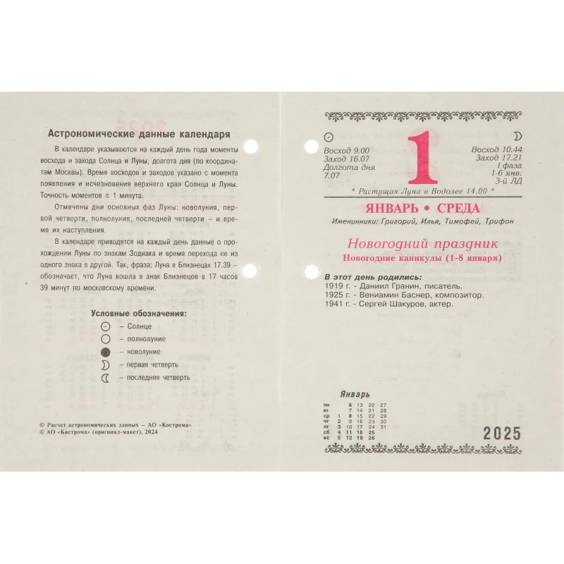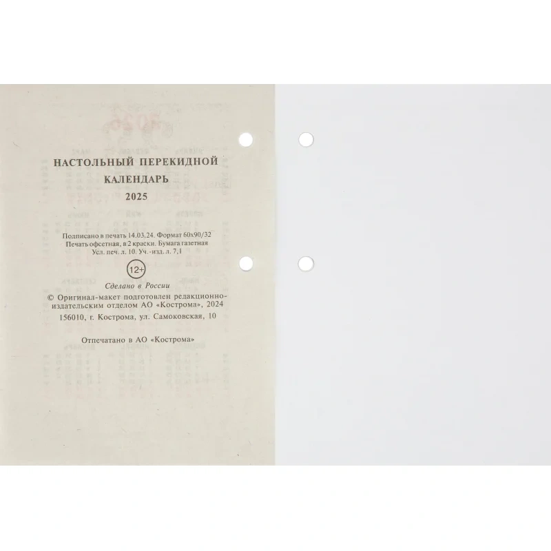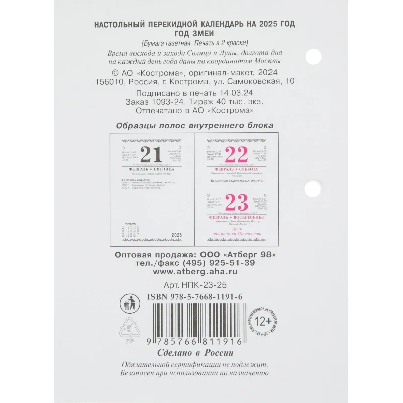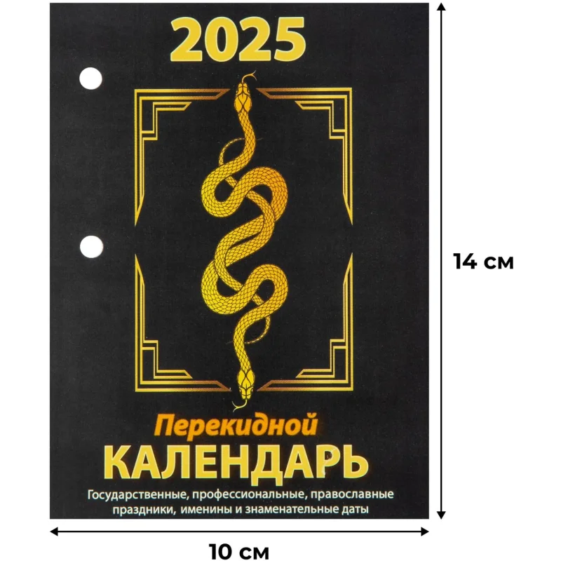 Календарь настол,перек,2025,Год Змеи,газ,2 кр,100х140,НПК-23-25 Календарь настольный перекидной 2025 год Символ года (10х14 см). Настольный перекидной календарь на 2025 год, 2-красочный, на газетной бумаге, формат 100х140 мм, в индивидуальной упаковке (термопленка ПВХ). Количество страниц: 320. Расстояние от края до верхнего прокола - 18 мм. Расстояние между проколами - 40 мм. Блок: бумага газетная плотностью 48 г/м2. Печать блока в две краски. Обложка: бумага мелованная плотностью 170 г/м2. Печать обложки в четыре краски. В календаре отмечены государственные, профессиональные, православные праздники, именины, знаменательные даты.