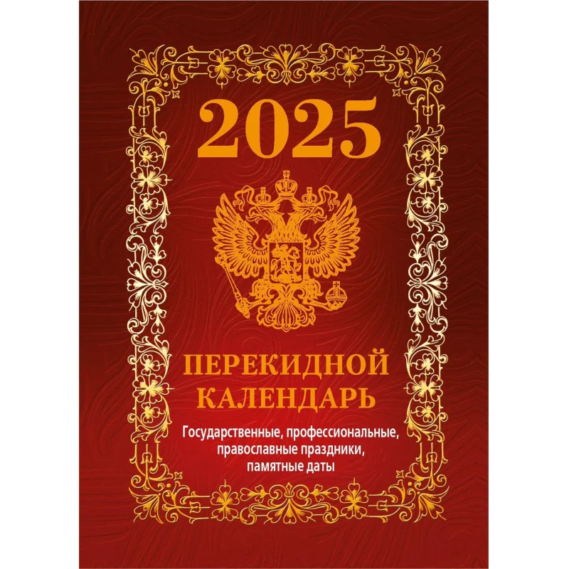 Календарь настол,перек,2025,Гос.симв.Вид1(бордо),офс,4кр,100х140,НПК-41-25 Настольный перекидной календарь на 2025 год, 4-красочный, на офсетной бумаге, формат 100х140 мм, в индивидуальной упаковке (термопленка ПВХ). Количество страниц: 320. Расстояние от края до верхнего прокола - 18 мм. Расстояние между проколами - 40 мм. Блок: бумага офсетная плотностью 60 г/м2. Печать блока в четыре краски. Обложка: бумага мелованная плотностью 170 г/м2. Печать обложки в четыре краски. В календаре отмечены государственные, профессиональные, православные праздники, памятные даты.