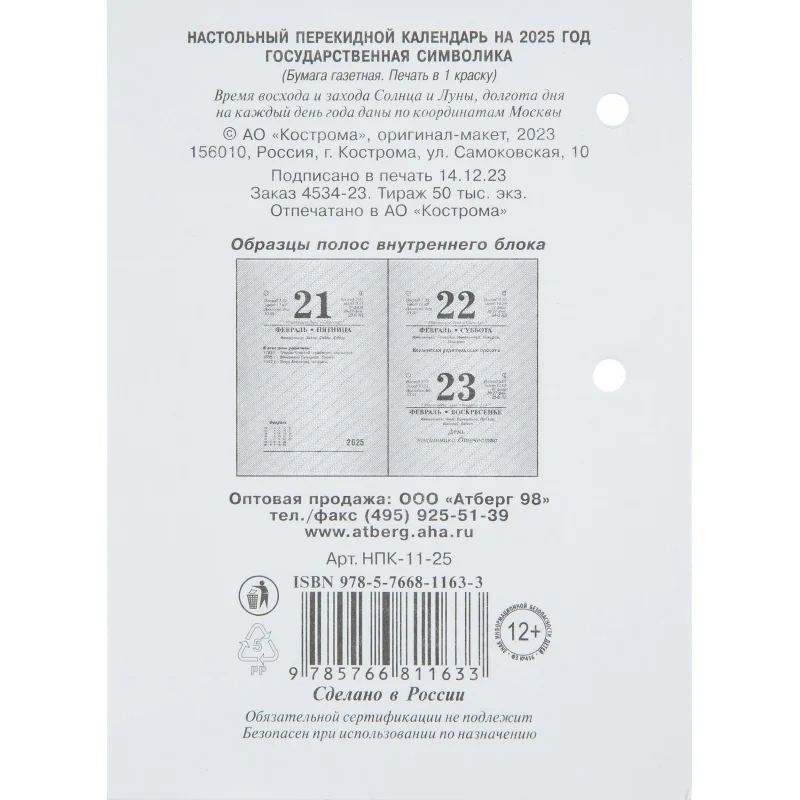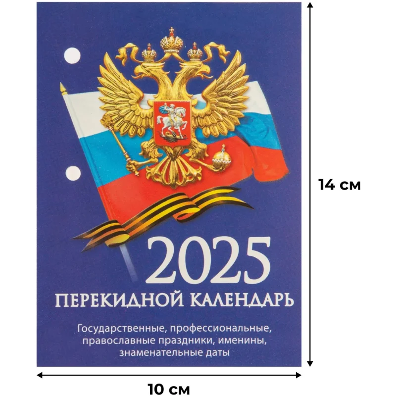 Календарь настол,перек,2025,Госуд.символика,газ,1 кр,100х140, НПК-11-25 Календарь настольный перекидной 2025 год Госсимволика (10х14 см). Настольный перекидной календарь на 2025 год, 1-красочный, на газетной бумаге, формат 100х140 мм, в индивидуальной упаковке (термопленка ПВХ). Количество страниц: 320. Расстояние от края до верхнего прокола - 18 мм. Расстояние между проколами - 40 мм. Блок: бумага газетная плотностью 48 г/м2. Печать блока в одну краску. Обложка: бумага мелованная плотностью 170 г/м2. Печать обложки в четыре краски. В календаре отмечены государственные, профессиональные, православные праздники, именины, знаменательные даты.