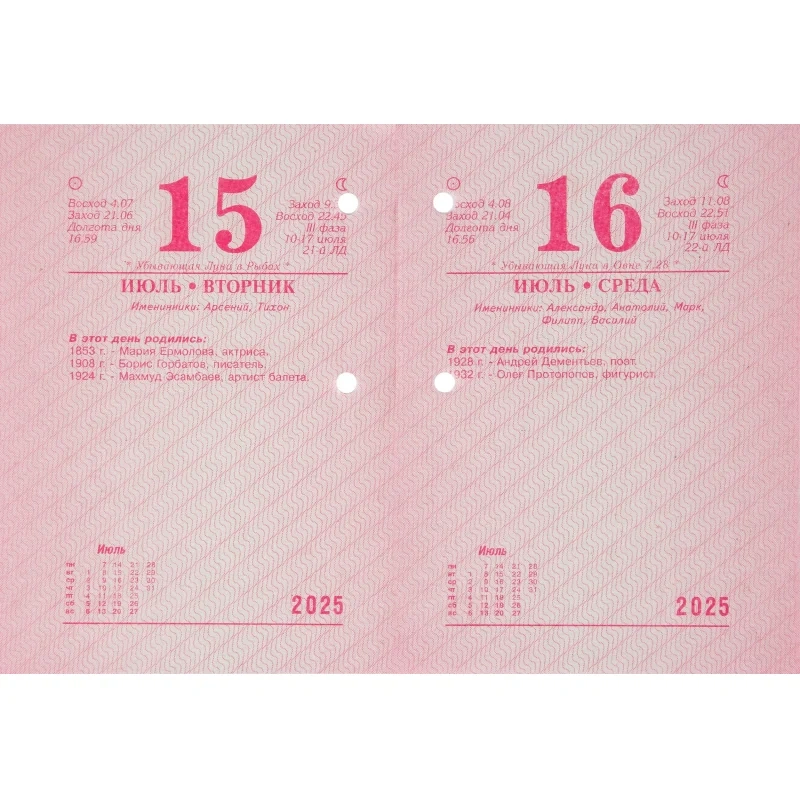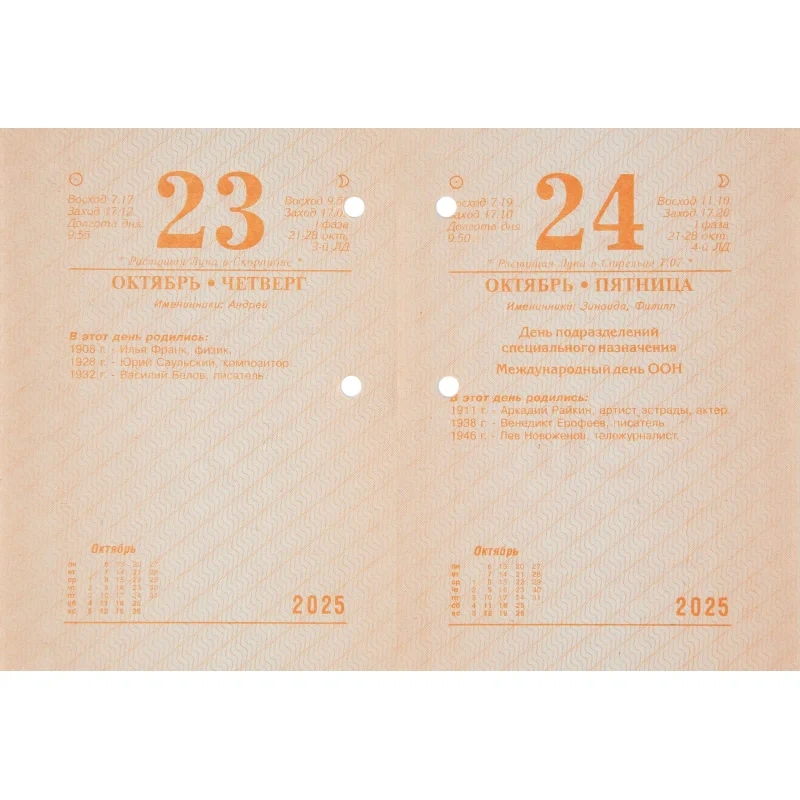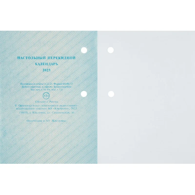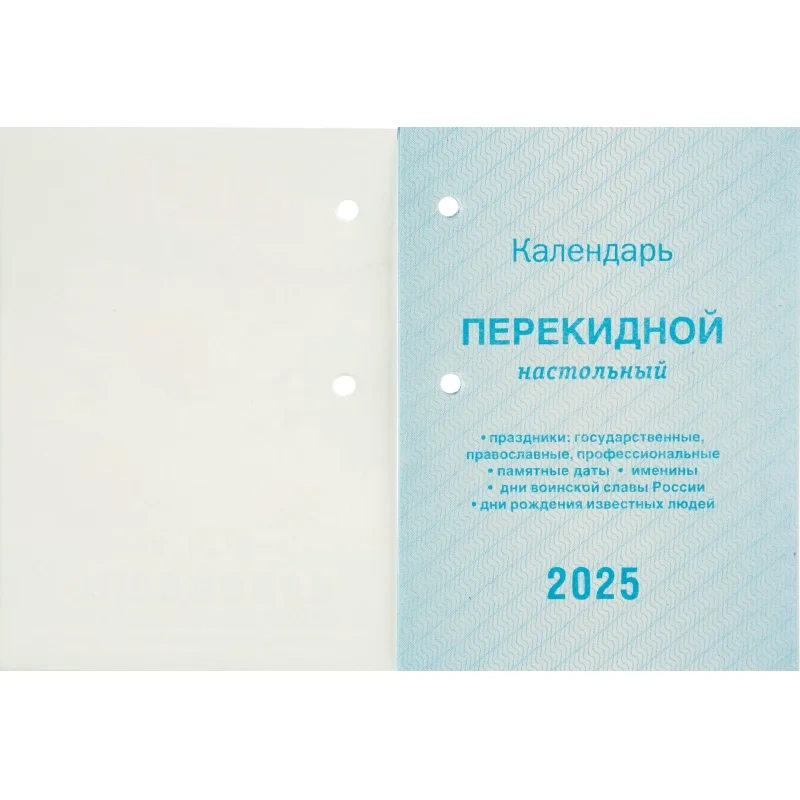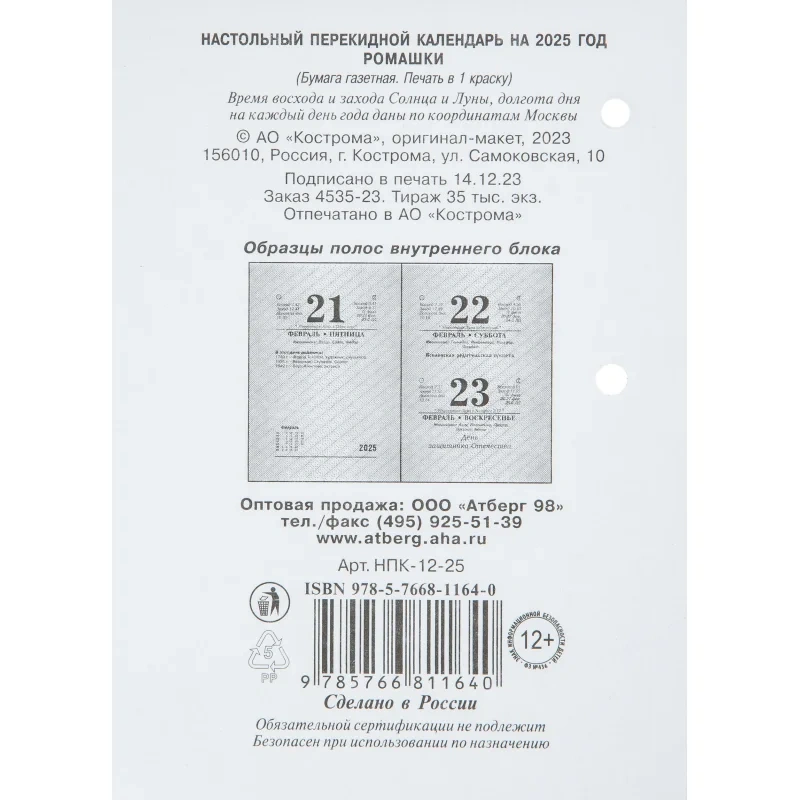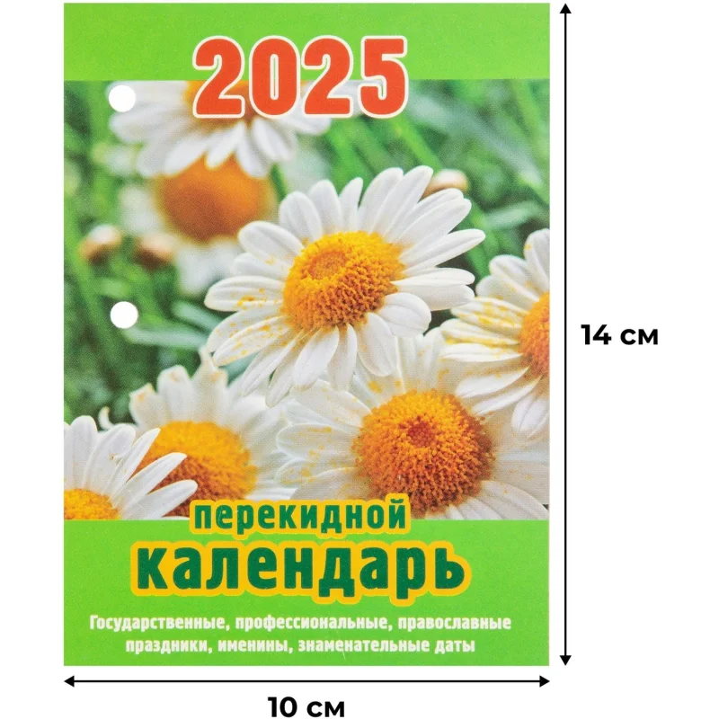 Календарь настол,перек,2025,Ромашки,газ,1 кр,100х140, НПК-12-25 Календарь настольный перекидной 2025 год Ромашки (10х14 см). Настольный перекидной календарь на 2025 год, 1-красочный, на газетной бумаге, формат 100х140 мм, в индивидуальной упаковке (термопленка ПВХ). Количество страниц: 320. Расстояние от края до верхнего прокола - 18 мм. Расстояние между проколами - 40 мм. Блок: бумага газетная плотностью 48 г/м2. Печать блока в одну краску. Обложка: бумага мелованная плотностью 170 г/м2. Печать обложки в четыре краски. В календаре отмечены государственные, профессиональные, православные праздники, именины, знаменательные даты.