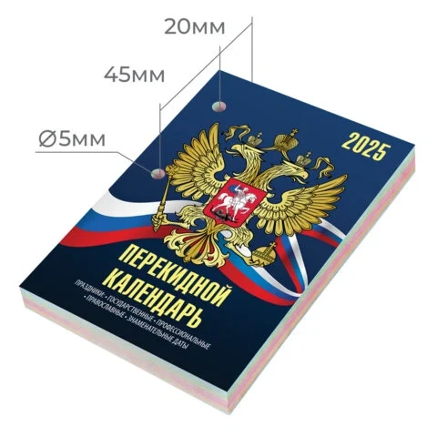 Блок календаря на 2025 год напечатан на офсетной бумаге плотностью 60 г/м2 в четыре краски с выделением цветом выходных и праздничных дней. Справочная информация на 160 листах: календарь на текущий месяц, часы восхода и захода солнца, долгота дня, лунный календарь, праздники. Имеет государственную тематику.