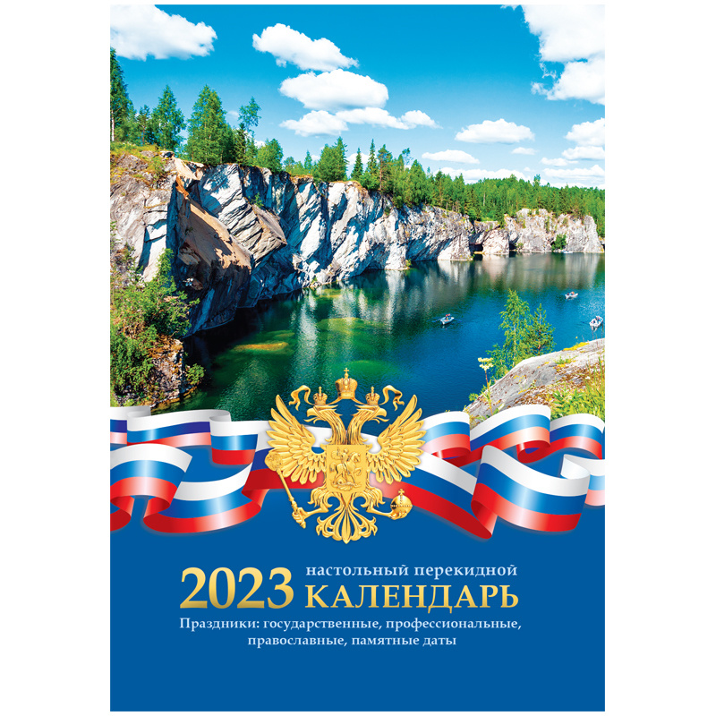 Календарь настольный перекидной OfficeSpace «Российская символика» на 2023 год ? незаменимая вещь в жизни делового человека и отличный помощник для офиса. Размер вертикального календаря – 100?140 мм. Календарный блок из 160 листов изготовлен из газетной белой бумаги плотностью 45 г\\м2 с печатью в 2 краски. Верхняя и нижняя подложки изготовлены из картона плотностью 120 г/м2. Нижняя подложка имеет цветность в 1 краску, верхняя – полноцветная. Расстояние между внутренними краями отверстия – 4 см. Календарь выполнен в тематике российской символики.
