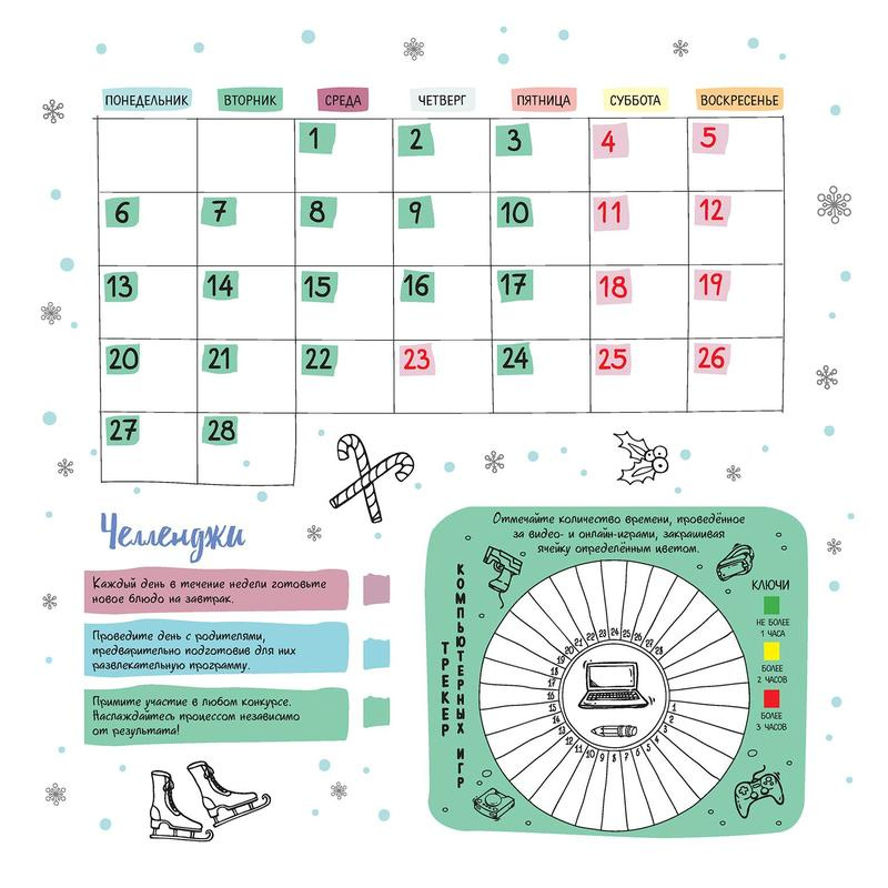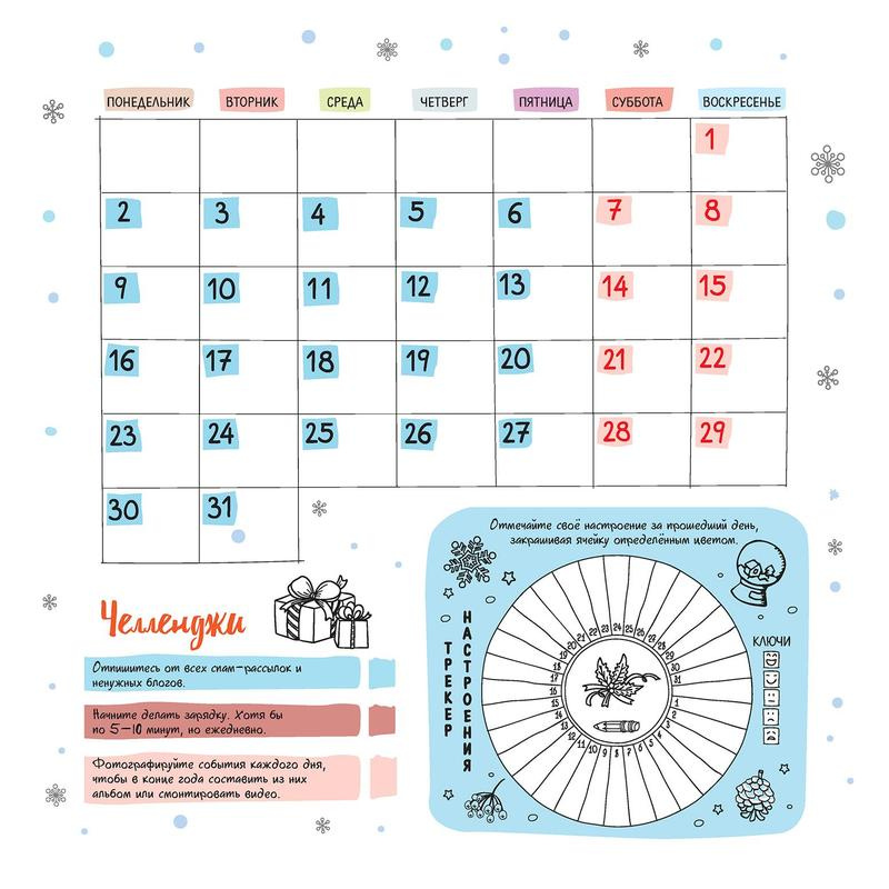 Блок: мелованная высокохудожественная бумага 115 г/м2, размер 290?290 мм, в раскрытом виде 290?580 мм, 12 листов 2 обложки. Обложка: мелованная высокохудожественная бумага 250 гр/м2, ламинация глянцевая 1 0. Крепление: скрепка (2 шт.). Дополнительно: вырубка круглого отверстия для подвешивания в обложке и блоке;адвент-календарь . Упаковка: пакет с клеевым клапаном и верхним