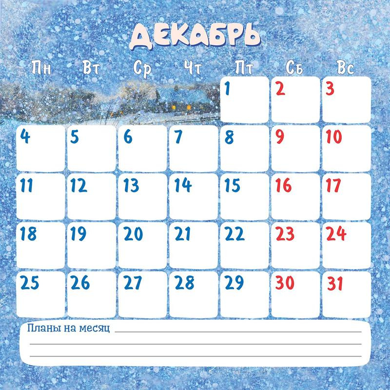 Блок: мелованная высокохудожественная бумага 115 г/м2, размер 290?290 мм, в раскрытом виде 290?580 мм, 12 листов 2 обложки. Обложка: мелованная высокохудожественная бумага 250 гр/м2, ламинация глянцевая 1 0. Крепление: скрепка (2 шт.). Дополнительно: вырубка круглого отверстия для подвешивания в обложке и блоке;адвент-календарь . Упаковка: пакет с клеевым клапаном и верхним еврослотом. Карманный календарь — в подарок!