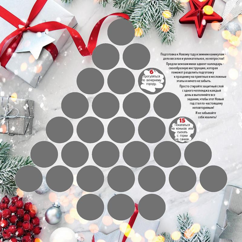 Блок: мелованная высокохудожественная бумага 115 г/м2, размер 290?290 мм, в раскрытом виде 290?580 мм, 12 листов 2 обложки. Обложка: мелованная высокохудожественная бумага 250 гр/м2, ламинация глянцевая 1 0. Крепление: скрепка (2 шт.). Дополнительно: вырубка круглого отверстия для подвешивания в обложке и блоке;адвент-календарь . Упаковка: пакет с клеевым клапаном и верхним еврослотом. Карманный календарь — в подарок!