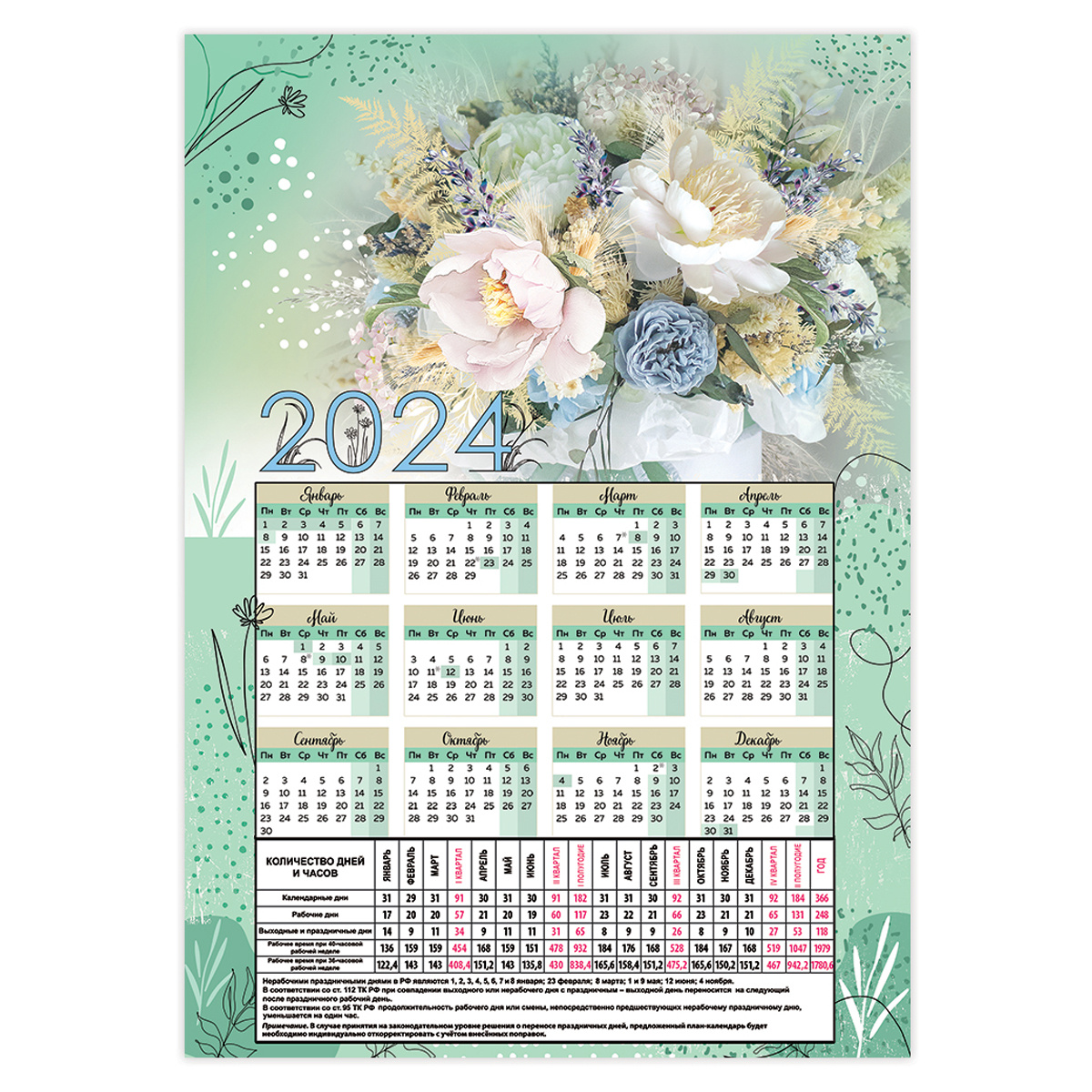 Календарная листовая продукция с сеткой на 12 месяцев и производственным табелем. Набор из 4-х дизайнов, по 10 штук каждого вида, мелованная бумага