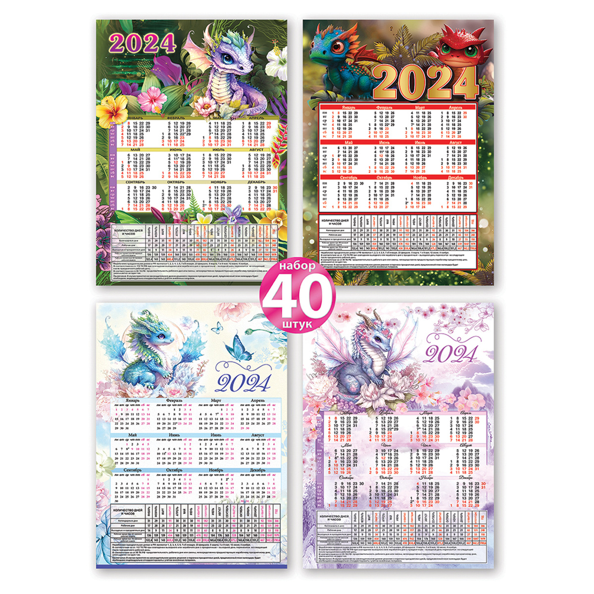 Календарная листовая продукция с сеткой на 12 месяцев и производственным табелем, с символом года. Набор из 4-х дизайнов, по 10 штук каждого вида, мелованная бумага