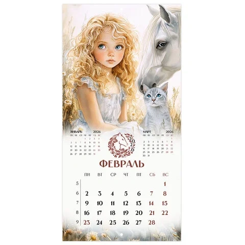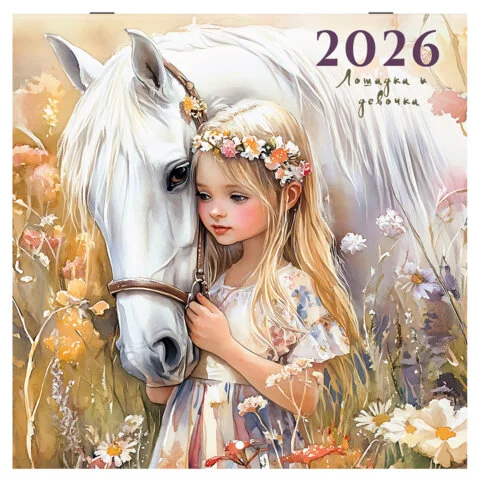 Календарь настенный перекидной 2026 г., BRAUBERG, 12 листов, 28,5х28,5 см, 'Лошадка и девочка', 1169