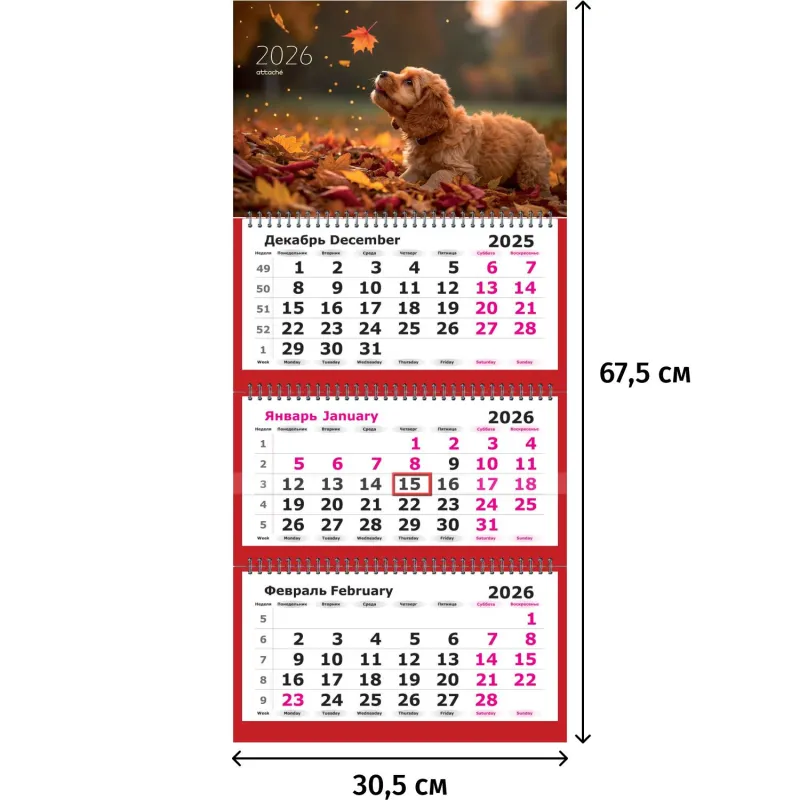 Календарь настенный трёхблочный Attache «Щенок» 2026, размер 30.5×67.5 см, на...
