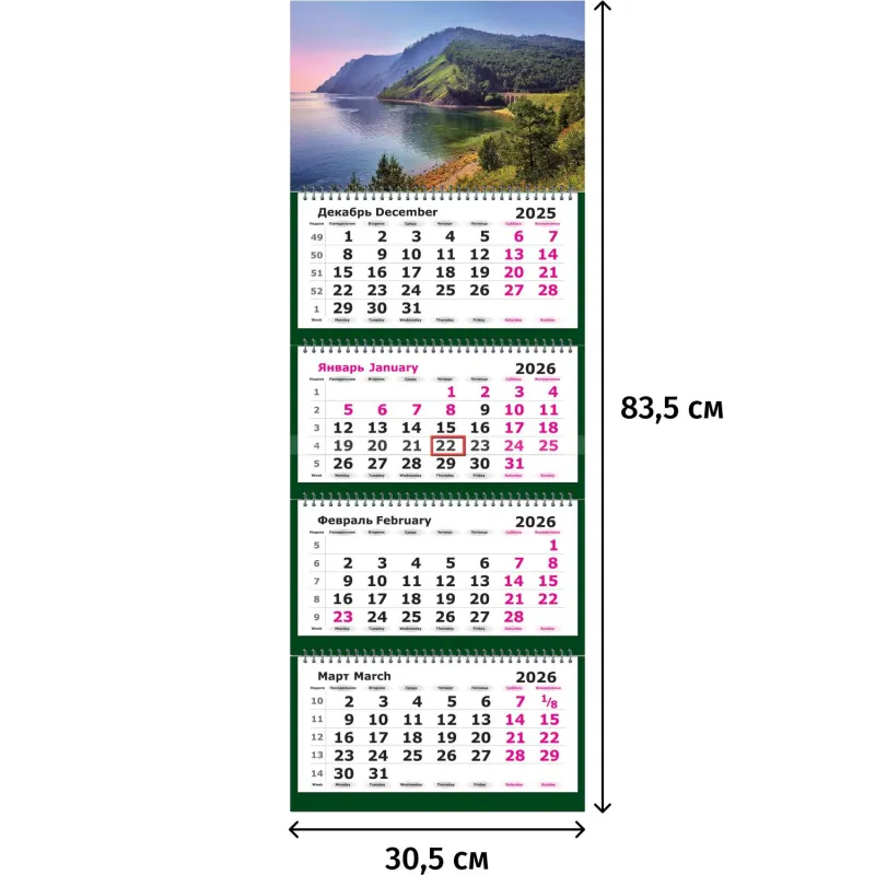 Календарь настенный 4-х блочный 2026 Пейзаж Байкал 30.5×83.5 смНастенный четырехблочный о...