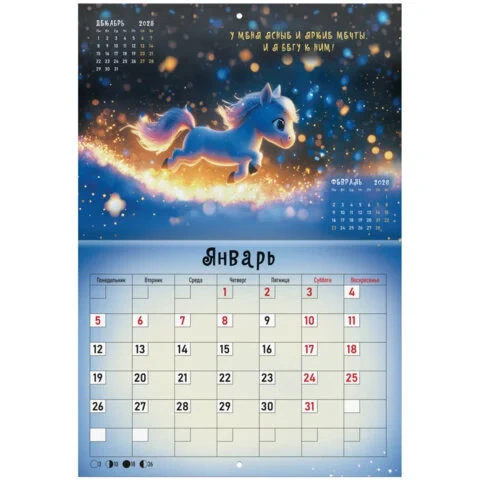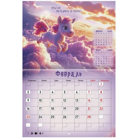 Яркая, красочная картинка дополнена календарной сеткой на месяц. Содержит 12 листов. Блок календаря ...