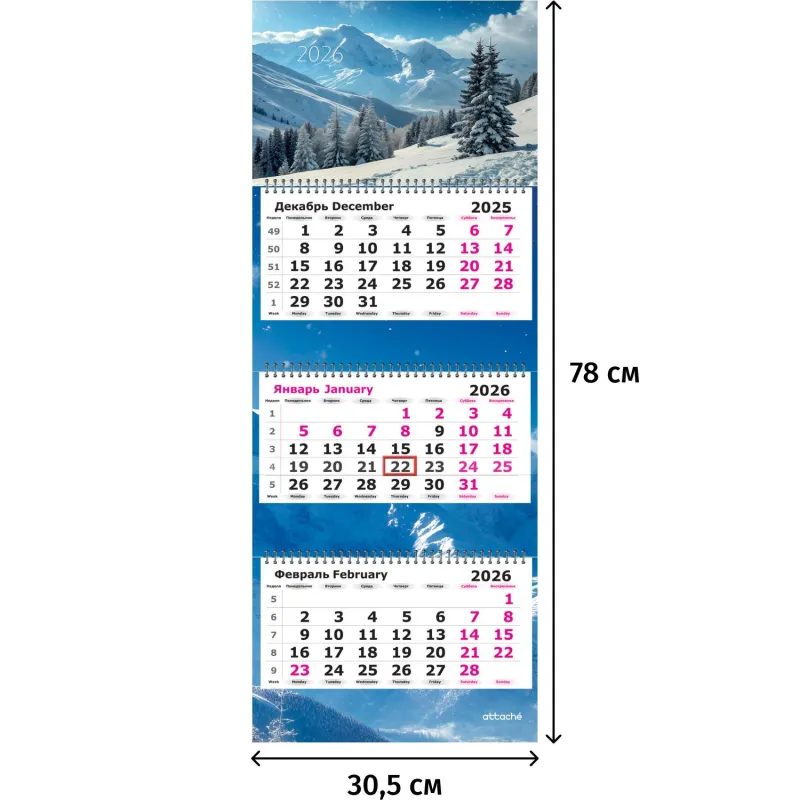 Календарь настенный 3-х блочный 2026 Attache, 305х675, Москва, 80г