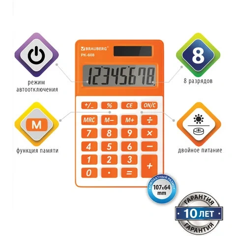 Калькулятор карманный BRAUBERG PK-608-RG (107x64 мм), 8 разрядов, двойное питание, ОРАНЖЕВЫЙ, 250522