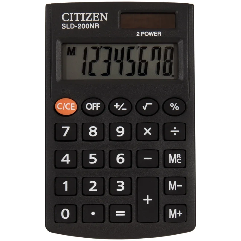 8-ми разрядный карманный калькулятор Citizen SLD-200NR предназначен для выполнения арифметических операций. Базовые функции помогут сделать простые расчёты, вычислить квадратный корень и проценты, выполнить операции с памятью. Двойное питание (солнечная батарея + батарейка AG10(LR1130)) и автоматическое отключение увеличивают срок службы. Упакован в картонную коробку. Размер калькулятора – 62*98*10 мм, вес – 40 г, цвет – чёрный. Гарантия 5 лет. Карманные калькуляторы идеально подойдут взрослым и детям, они компактны и надежны.