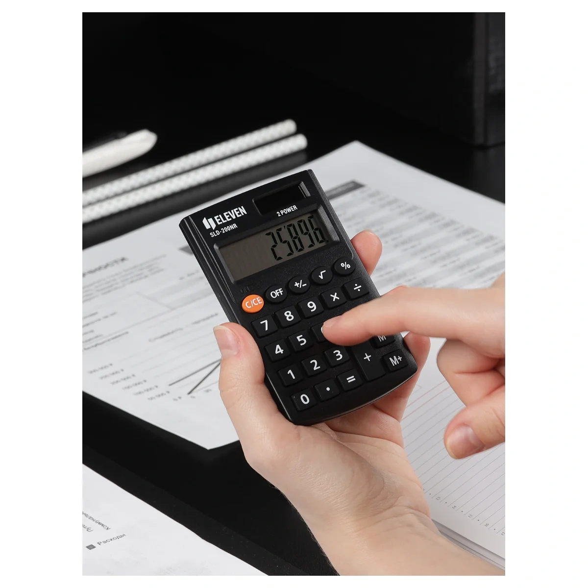 8-ми разрядный карманный калькулятор Eleven SLD-200NR предназначен для выполнения арифметических операций. Базовые функции помогут сделать простые расчёты, вычислить квадратный корень и проценты, выполнить операции с памятью. Двойное питание (солнечная батарея + батарейка AG10(LR1130)) и автоматическое отключение увеличивают срок службы. Упакован в картонную коробку. Размер калькулятора – 62*98*10 мм, вес – 40 г, цвет – чёрный. Гарантия 5 лет. Карманные калькуляторы идеально подойдут взрослым и детям, они компактны и надежны.