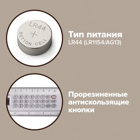 8-ми разрядный калькулятор производит все основные арифметические действия, в том числе вычисление с памятью, вычисление с процентами, возведение в степень и извлечение квадратного корня. Вводимые данные и результаты вычислений хорошо видны на жидкокристаллическом дисплее благодаря надежному японскому коннектору. Прорезиненные антискользящие кнопки гарантируют комфортное использование и долгий срок службы изделия. Работает от сменной батарейки LR44 (LR1154/AG13). Размер дисплея: 37х14 мм. Цвет: серый.