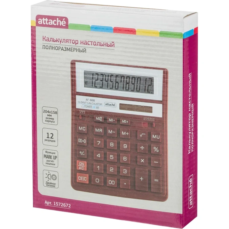 Калькулятор Attache AF-888 настольный в пластиковом корпусе темно-красного цвета с 12-разрядным ЖК-дисплеем . Имеет оптимальный набор вычислительных функций: основные математические операции, расчет процентов, расчет наценки, извлечение квадратного корня, запоминание промежуточных результатов. Калькулятор имеет функцию автоматического отключения питания. Удобная клавиатура снабжена кнопкой ввода двойного нуля. В калькуляторе имеется два источника питания: солнечная батарея и батарейка G10 (не подлежит замене), а также есть место для установки батареи AA (не входит в комплект). Размер корпуса: 204×158×38 мм. Размер дисплея: 111×24 мм. Материал кнопок клавиатуры: пластик. Перед использованием внимательно ознакомьтесь с инструкцией.