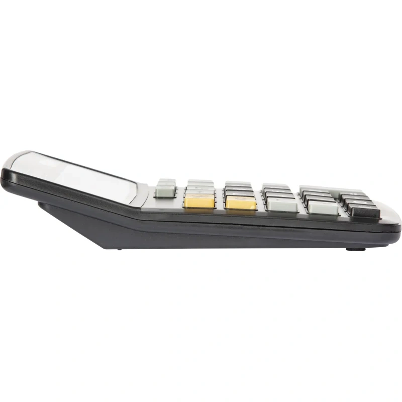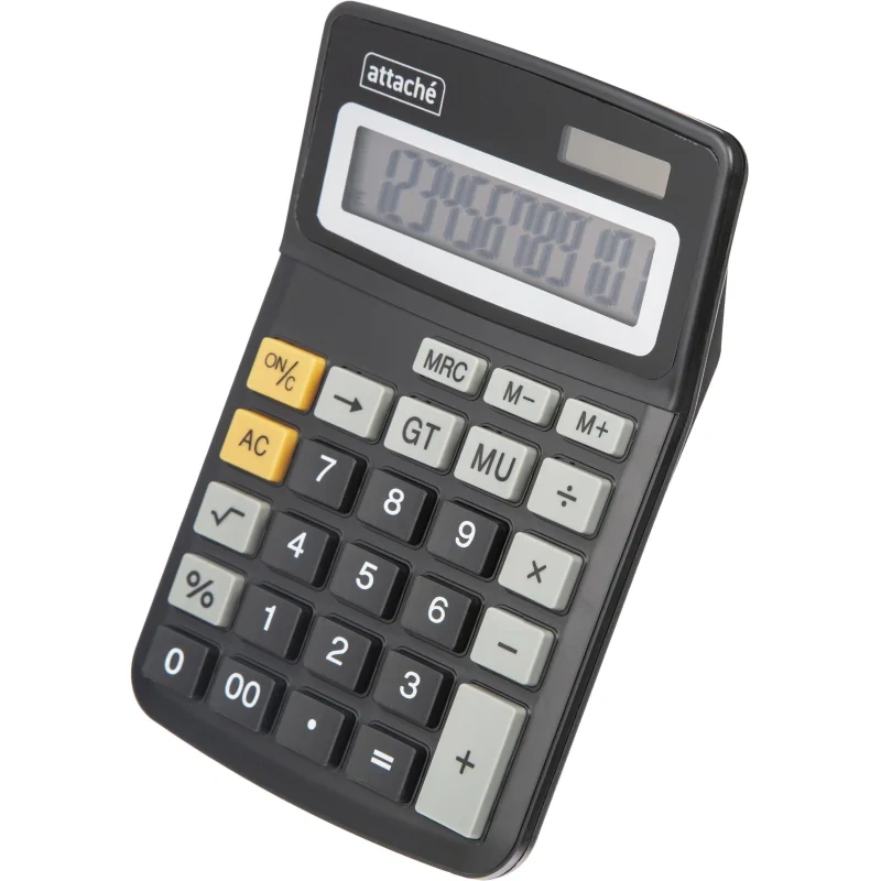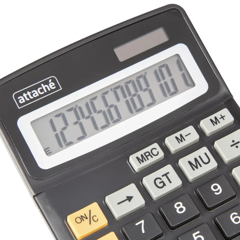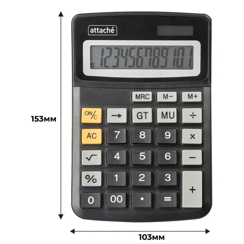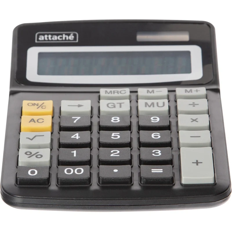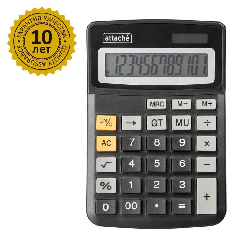 Калькулятор Attache настольный в пластиковом корпусе с 12-разрядным ЖК-дисплеем . Имеет оптимальный набор вычислительных функций: основные математические операции, расчет процентов, извлечение квадратного корня, запоминание промежуточных результатов. Позволяет корректировать введенное число. Удобная клавиатура снабжена кнопкой ввода двойного нуля. В калькуляторе имеется два источника питания: солнечная батарея и батарейка LR1130. Размер: 153×103×32 мм. Тип клавиатуры: пластик. Наличие металлической панели: нет. Обращаем внимание, что батарейка не входит в комплектацию данного калькулятора. Cовместимые батарейки находятся в разделе «Расходные материалы». Автоматически отключается через 10 минут бездействия.