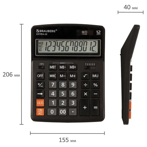 Калькулятор настольный BRAUBERG EXTRA-12-BK (206x155 мм), 12 разрядов, двойное питание, ЧЕРНЫЙ, 2504