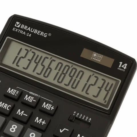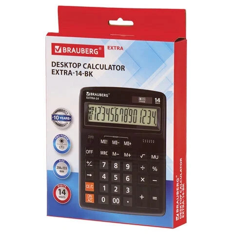 Калькулятор настольный BRAUBERG EXTRA-14-BK (206x155 мм), 14 разрядов, двойное питание, ЧЕРНЫЙ, 2504