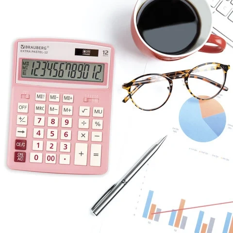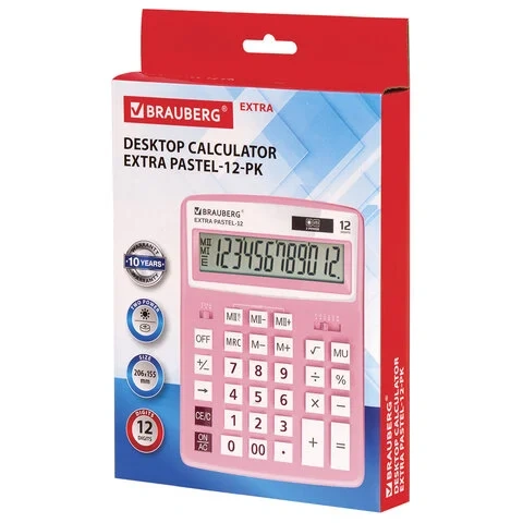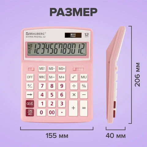 Калькулятор настольный BRAUBERG EXTRA PASTEL-12-PK (206x155 мм), 12 разрядов, двойное питание, РОЗОВ