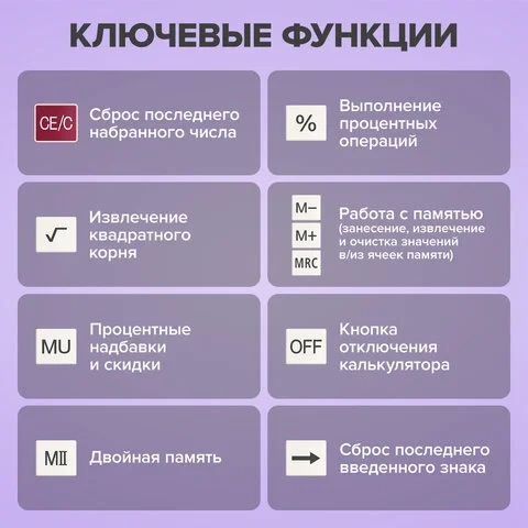 Калькулятор производит все основные арифметические действия: возведение в степень, вычисления с процентами, извлечение квадратного корня. Незаменим для бухгалтеров благодаря наличию клавиш двойной памяти, «00» и MU для расчетов налогов и торговой наценки. Переключатели округления и положения десятичного знака позволяют производить нужные настройки. Большой двенадцатиразрядный дисплей отображает большие значения с высокой точностью округления. Встроенный аккумулятор и солнечная батарея позволяют калькулятору работать при любом освещении, а клавиша выключения OFF и функция автоматического отключения (через 8-10 минут бездействия) позволяют максимально продлить срок его службы без замены батареи.