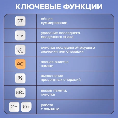 Корпус калькулятора выполнен с округлыми формами и лаконичным дизайном. 3D-кнопки с четким ходом, приятной тактильной отдачей и мягким звуком нажатия обеспечивают комфорт при работе.
