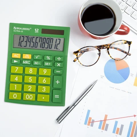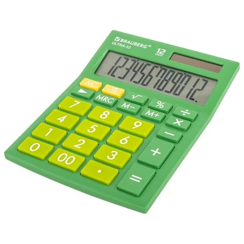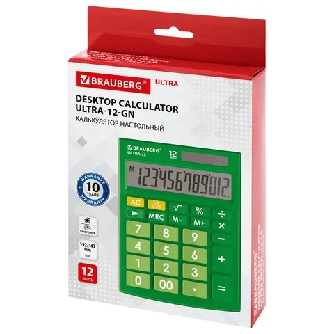 Калькулятор настольный BRAUBERG ULTRA-12-GN (192x143 мм), 12 разрядов, двойное питание, ЗЕЛЕНЫЙ, 250