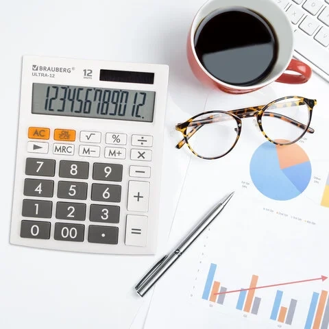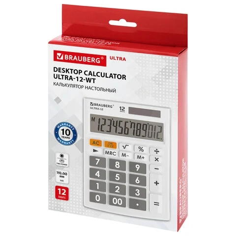 Калькулятор настольный BRAUBERG ULTRA-12-WT (192x143 мм), 12 разрядов, двойное питание, БЕЛЫЙ, 25049