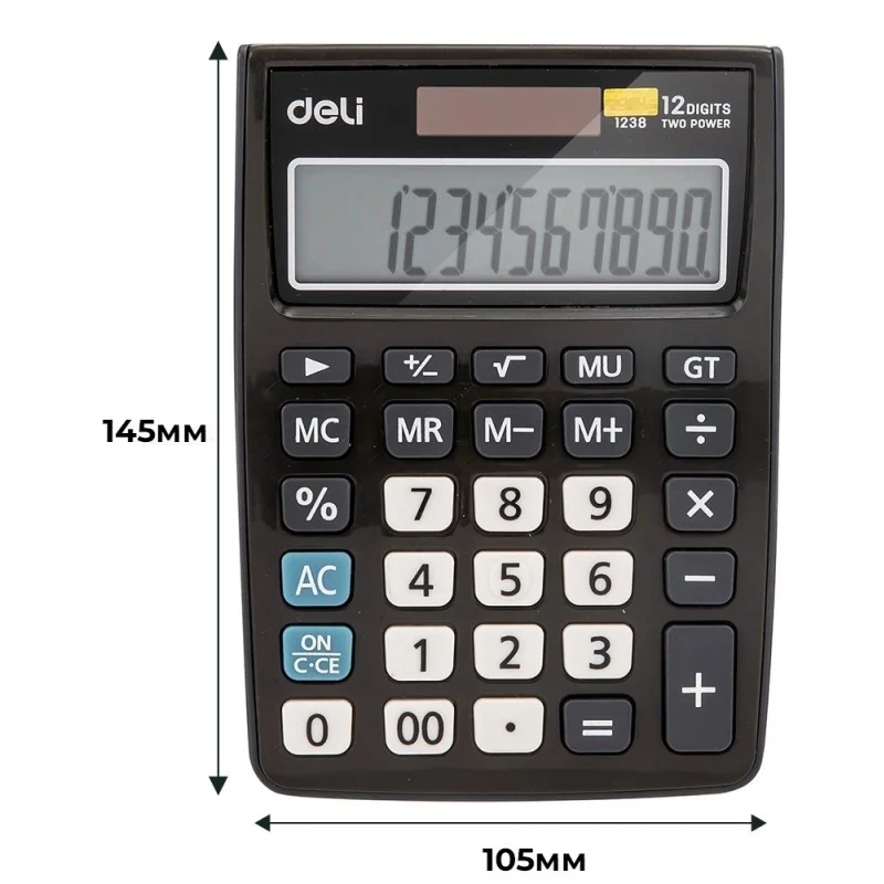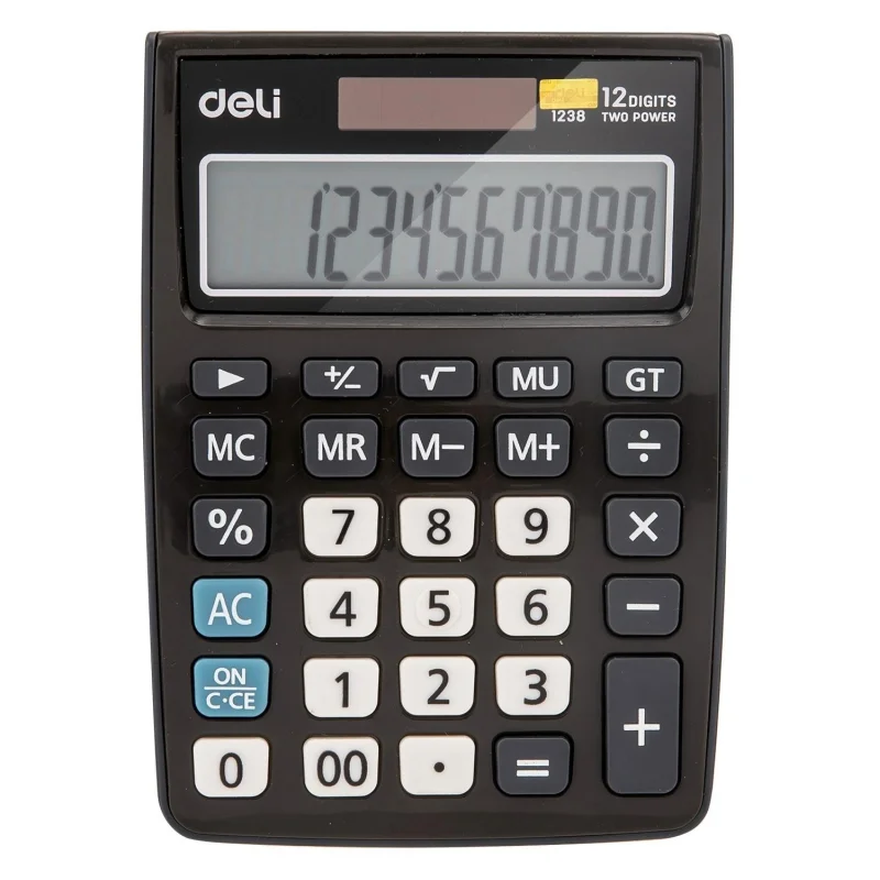 Простой и надежный настольный компактный калькулятор Deli в пластиковом корпусе поможет выполнить базовые вычисления везде, где бы Вы ни находились. Подойдет ученикам старших классов, бакалаврам, магистрам, студентам, научным работникам. Позволяет задавать настройки округления и количества знаков после запятой. Калькулятор производит все основные арифметические действия, вычисления с памятью, расчет процентов, извлечение квадратного корня и возведение в степень. Удобная клавиатура снабжена кнопкой ввода двойного нуля. Встроенный аккумулятор и солнечная батарея, образующие единую схему питания калькулятора, позволяют устройству работать при любом освещении. Разрядность дисплея: 12. Батарейка LR54 в комплекте. Наличие кнопки «Коррекция последнего введенного значения» — да. Размер калькулятора: 145×105×27 мм. Автоматически отключается через 5 — 12 минут бездействия.
