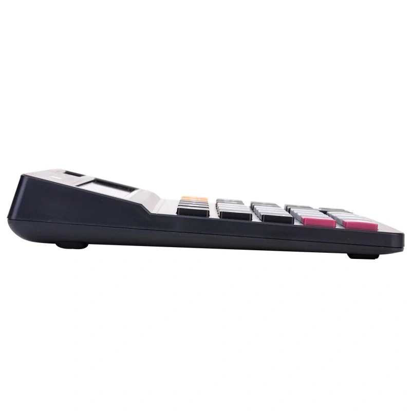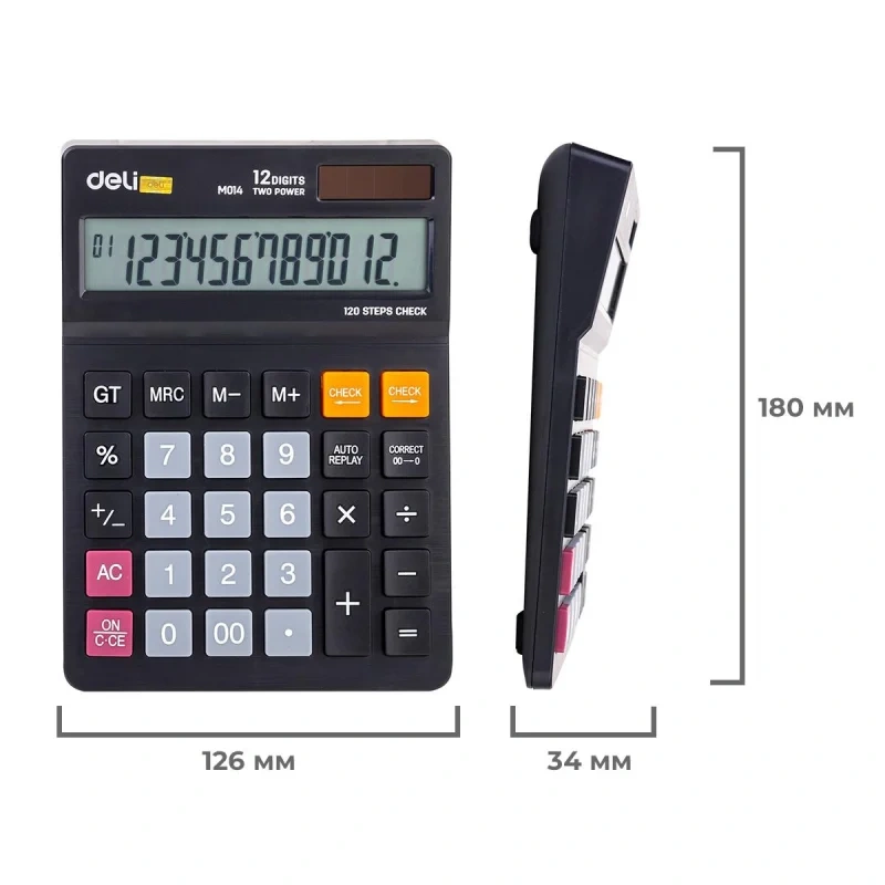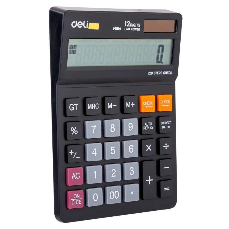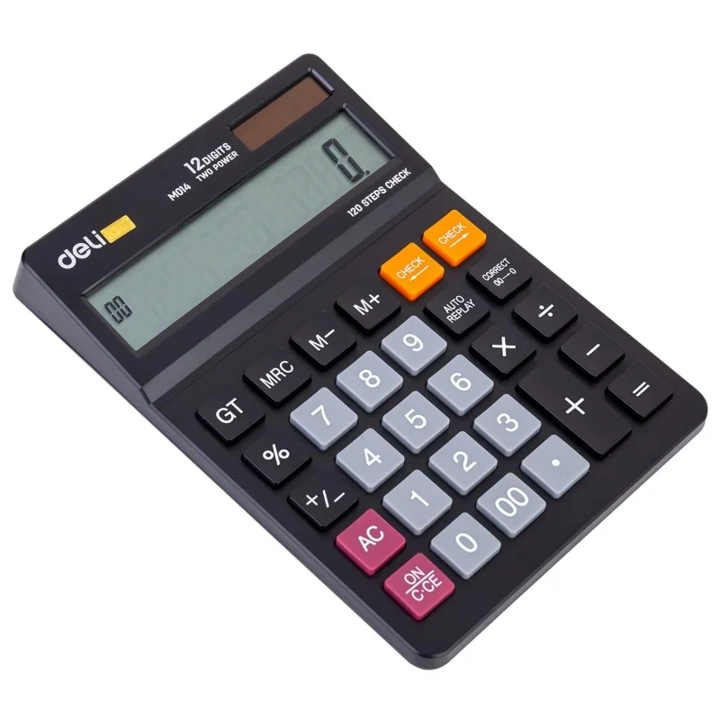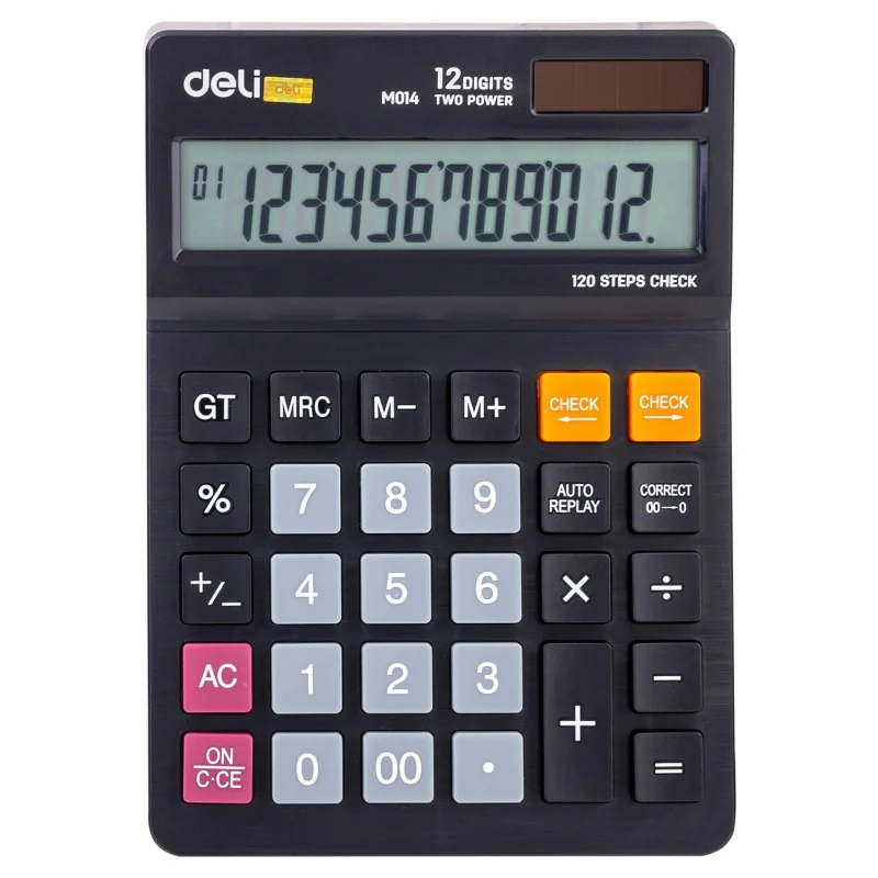 Настольный полноразмерный калькулятор Deli EM01420 в черном корпусе популярен как среди бухгалтеров, так и среди продавцов, банковских и офисных сотрудников. Изготовлен из противоударного пластика и отличается большим дисплеем с увеличенными символами для комфортной работы. Позволяет корректировать введенное число, задавать настройки округления и количества знаков после запятой. Оптимальный набор функций поможет автоматизировать расчеты: расчет процентов, кнопка «00», функция смены знака, функция итогового суммирования. Двойное питание (солнечная батарея) и автоматическое отключение через 5 — 12 минут бездействия увеличивают срок службы. Разрядность дисплея: 12. Размер: 180×126×34 мм. Батарейка LR44 в комплекте. Наличие кнопки «Коррекция последнего введенного значения» — да.