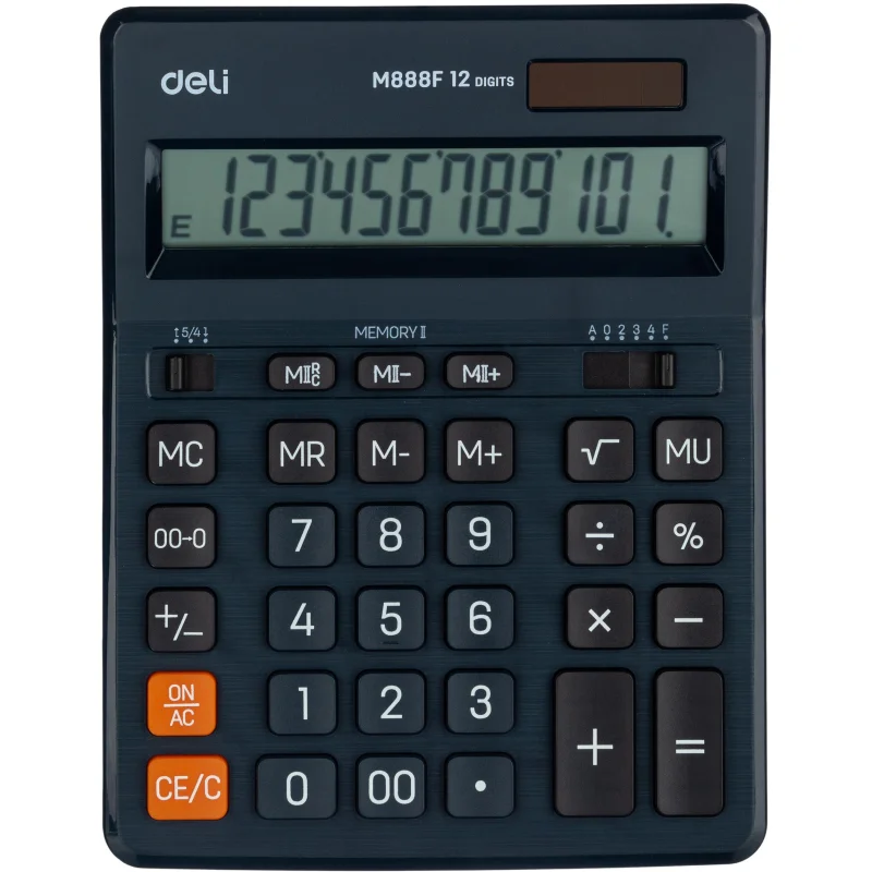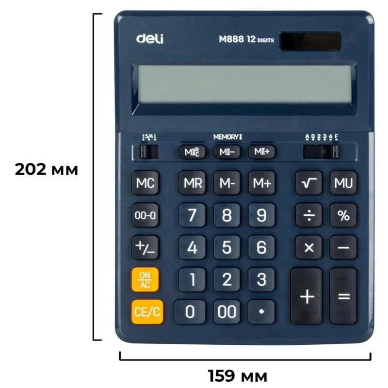 Настольный калькулятор Deli M888 — незаменимый помощник в офисе, школе и дома. Большой размер, эргономичная форма, удобные кнопки. Оптимальный набор функций поможет автоматизировать расчеты: вычисление квадратного корня, коррекция последнего введенного значения, кнопка 00, двойная память, расчет наценки, расчет процентов. Калькулятор в пластиковом корпусе, имеет большой 12-разрядный жидкокристаллический экран. Двойное питание. Размеры: 202.2×158.5×31.3 мм. В комплекте 1 батарейка LR54.
