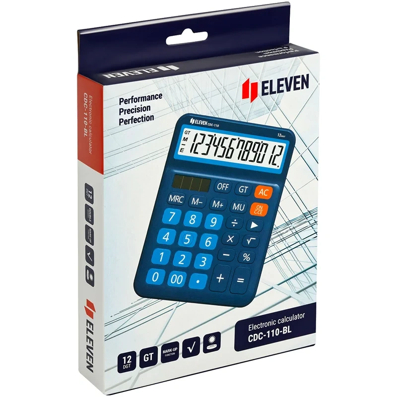 12-ти разрядный настольный калькулятор Eleven CDC-110-BL предназначен для выполнения арифметических операций. Размер калькулятора – 125*160*28 мм, вес – 140,9 г, цвет – синий. Оптимальный набор функций поможет автоматизировать расчёты: функция Grand Total (общая сумма), коррекция последнего введенного значения, расчёт наценки, кнопка «00». Двойное питание (солнечная батарея + батарея LR1130) и автоматическое отключение увеличивают срок службы. Упакован в картонную коробку. Гарантия – 5 лет.