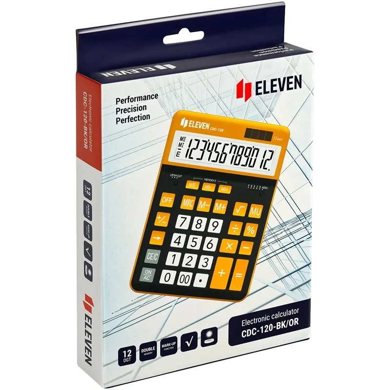 12-ти разрядный настольный калькулятор Eleven CDC-120-BK/OR предназначен для выполнения арифметических операций. Размер калькулятора – 155*206*38 мм, вес – 230,9 г, цвет – черный/оранжевый. Незаменимый помощник в офисе, школе и дома. Оптимальный набор функций поможет автоматизировать расчёты: коррекция последнего введенного значения, расчёт наценки, кнопка «00», двойная память. Двойное питание (солнечная батарея + батарея LR44) и автоматическое отключение увеличивают срок службы. Упакован в картонную коробку. Гарантия – 5 лет.