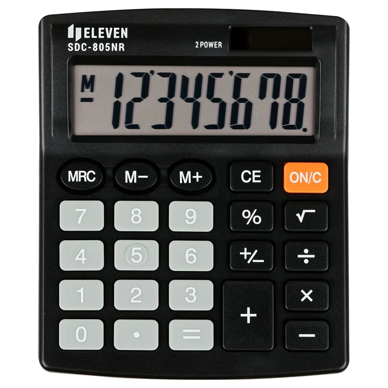 8-ми разрядные малые настольные калькуляторы Eleven SDC-805NR – простые и компактные устройства, предназначенные для быстрых элементарных расчётов. Оптимальный набор функций поможет автоматизировать расчёты: вычисление квадратного корня, функция смены знака. Двойное питание (солнечная батарея + батарея AG10(LR1130)) и автоматическое отключение увеличивают срок службы. Размер калькулятора –105*120*21мм, вес – 87 г, цвет – чёрный. Гарантия 5 лет.