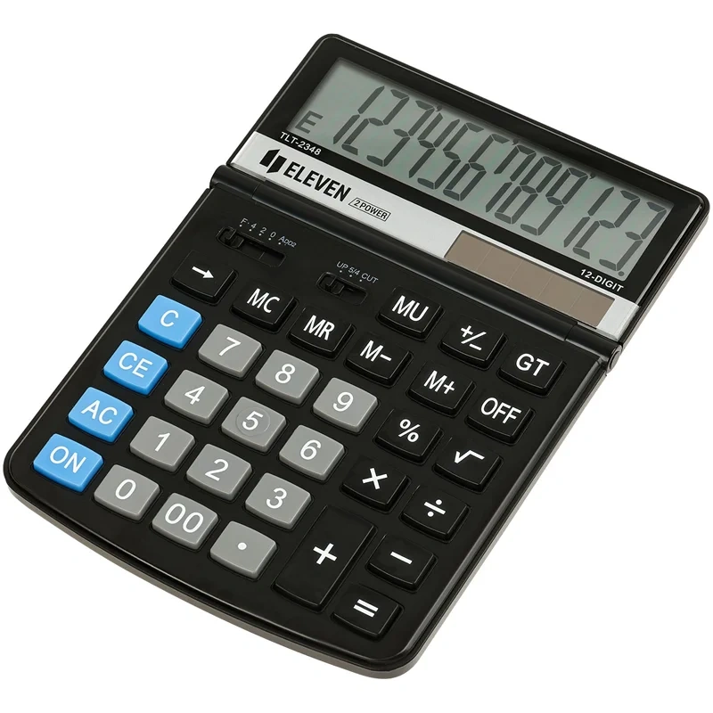 12-ти разрядный настольный калькулятор Eleven TLT-2348 с регулируемым углом наклона дисплея предназначен для выполнения арифметических операций. Размер калькулятора – 140*197*26 мм, вес – 226 г, цвет – черный. Оптимальный набор функций поможет автоматизировать расчёты: вычисление квадратного корня, коррекция последнего введенного значения, кнопка «00», расчёт наценки, смена знака, функция итогового суммирования. Двойное питание (солнечная батарея + батарея LR44) и автоматическое отключение увеличивают срок службы. Упакован в картонную коробку. Гарантия – 3 года.