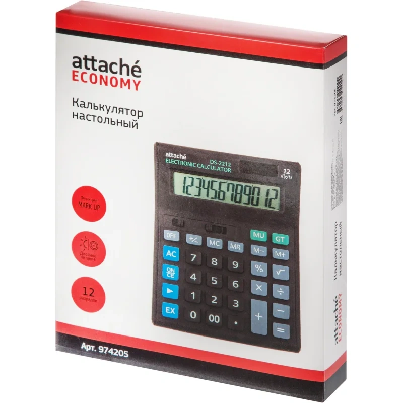 Калькулятор Attache Economy настольный в пластиковом корпусе с 12-разрядным ЖК-дисплеем . Имеет оптимальный набор вычислительных функций: основные математические операции, расчет процентов, извлечение квадратного корня, запоминание промежуточных результатов. Позволяет корректировать введенное число, задавать настройки округления и количества знаков после запятой. Удобная клавиатура снабжена кнопкой ввода двойного нуля. Питание калькулятора автоматически отключается после пяти минут бездействия. В калькуляторе имеется два источника питания: солнечная батарея батарейка AA. Размер: 190×145×45 мм. Тип клавиатуры: пластик. Наличие металлической панели: нет. Обращаем внимание, что батарейка не входит в комплектацию данного калькулятора. Cовместимые батарейки находятся в разделе «Расходные материалы». Наклон дисплея НЕ регулируется.