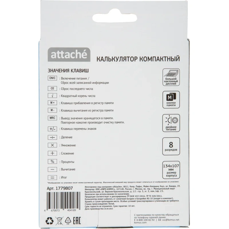 Калькулятор настольный КОМП Attache, AС-223BL,8р,дв. пит, голуб,134x107x34