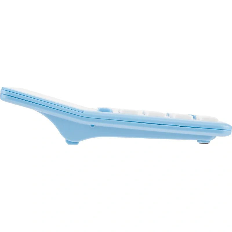 Эргономичная форма панели и крупные клавиши создают максимальный комфорт в использовании. Корпус изготовлен в голубом цвете с кнопками белого цвета. Оптимальный и необходимый набор функций, среди которых: MRC, M+, M-, расчет процентов. Функция коррекции вычислений: нет. Функция вычисления налога: нет. Пересчет курса валюты: нет. Наклонный дисплей: фиксированный. В калькуляторе имеется два источника питания: батарейка типа LR1130 (входит в комплект) и солнечная батарея.