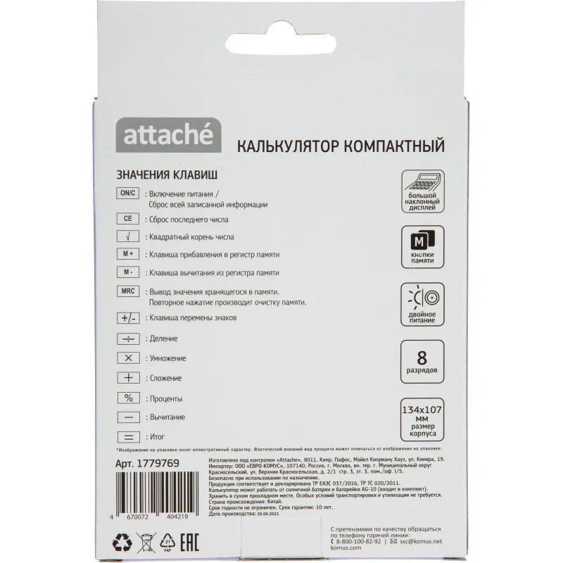 Размер калькулятора: 134×107×34 мм. Материал корпуса и клавиатуры: пластик. Вес: 0.1 кг. Число строк дисплея: 1. Цвет: фиолетовый. Гарантийный срок: 12 мес.