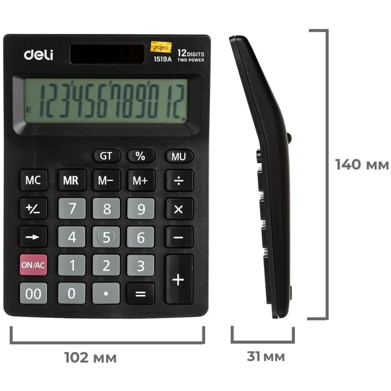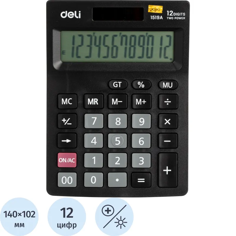 Калькулятор Deli E1519A в черном корпусе популярен как среди бухгалтеров, так и среди продавцов, банковских и офисных сотрудников. Изготовлен из противоударного пластика и отличается большим дисплеем с увеличенными символами для комфортной работы. Позволяет корректировать введенное число, задавать настройки округления и количества знаков после запятой. Калькулятор имеет оптимальный набор вычислительных функций. Разрядность дисплея: 12-разрядный. Размер калькулятора: 140×102×31 мм.
