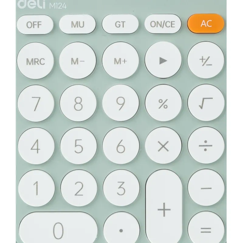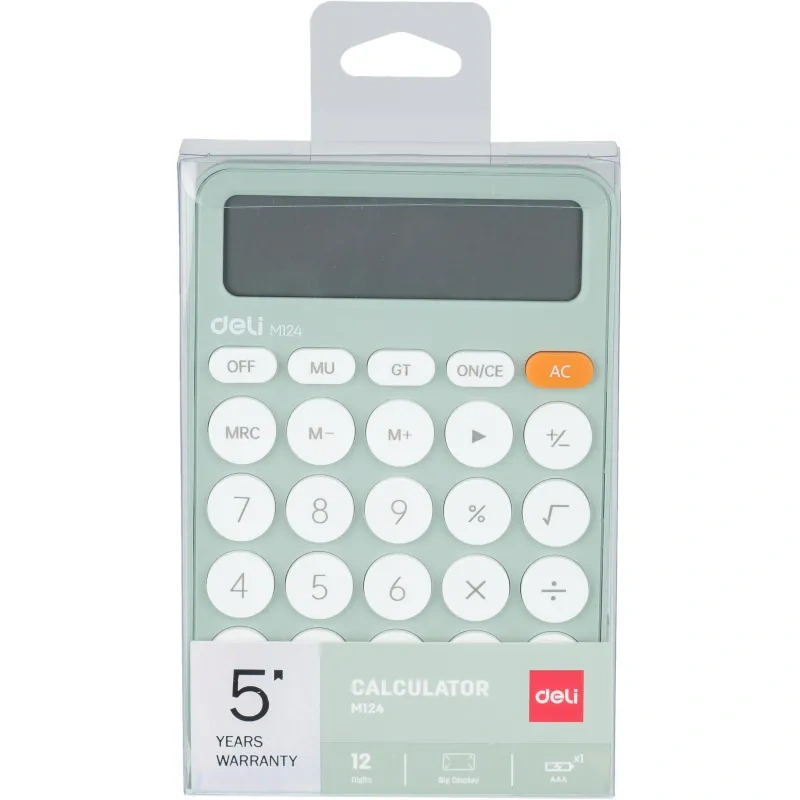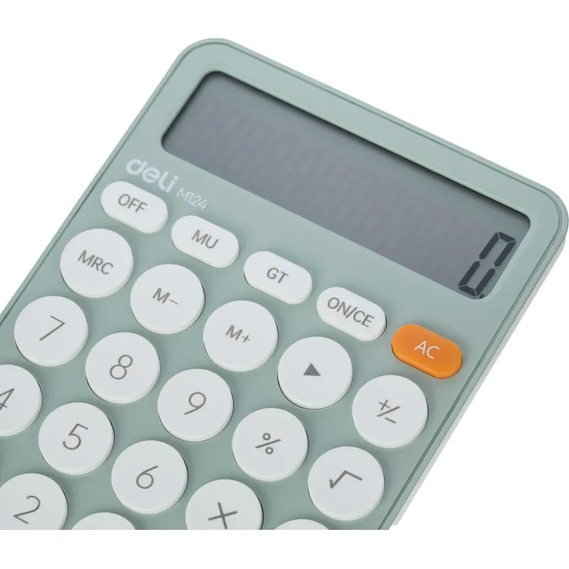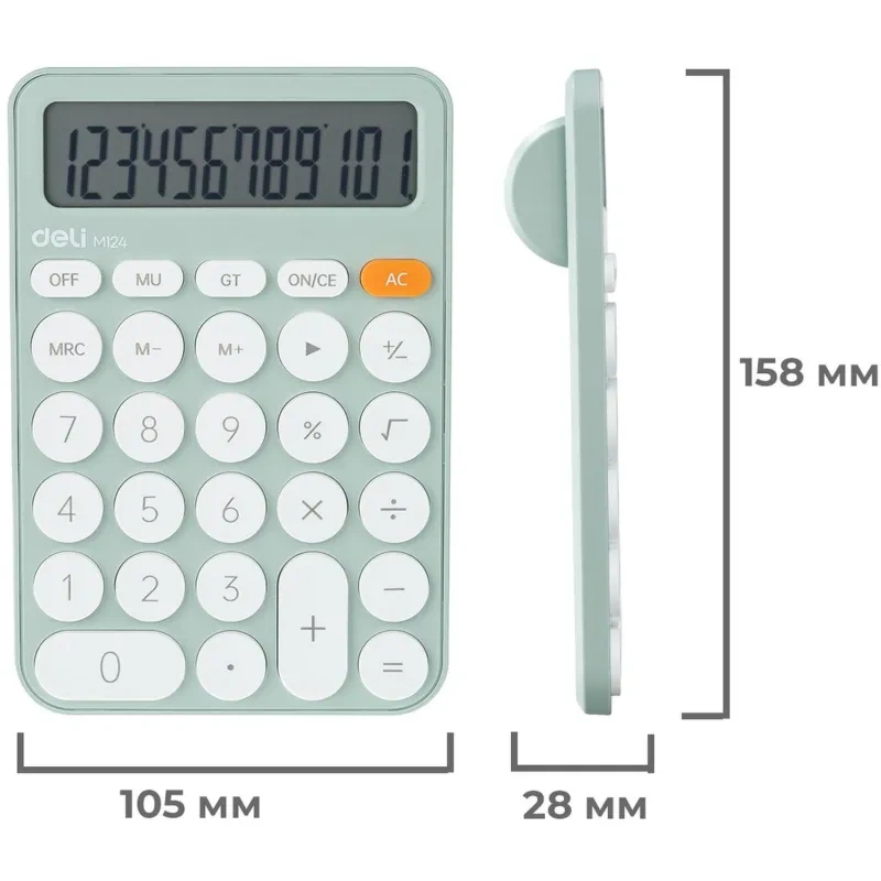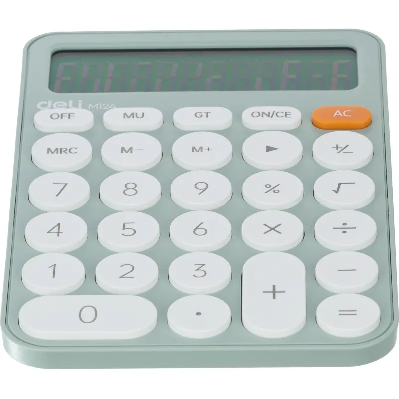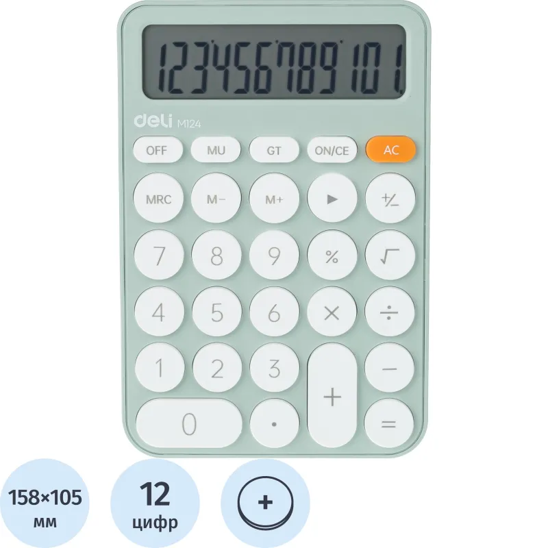Калькулятор настольный компактный Deli EM124 в пластиковом корпусе, предназначен для выполнения сложных математических расчетов. Изготовлен из противоударного пластика. Калькулятор Deli — незаменимый помощник в офисе, школе и дома. Он компактный, удобный, прочный и надежный. Оптимальный набор функций поможет автоматизировать расчеты: вычисление квадратного корня, коррекция последнего введенного значения, расчет процентов, двойная память, расчет наценки, смена знака. Большой яркий дисплей калькулятора, эргономичный наклон корпуса и крупная клавиатура позволяют работать эффективнее. Может использоваться как бухгалтерский, школьный, офисный или домашний калькулятор. Имеет защиту памяти при отключении питания. Автоматическое отключение через 8 мин без использования или кнопкой OFF. Оригинальный яркий калькулятор работает от батарейки (в комплекте). Благодаря компактному размеру калькулятор не займет много места на рабочем столе. Цвет: зеленый. Размер: 158×105×28 мм. Количество строк дисплея: однострочный. Разрядность дисплея: 12. Тип питания: 1 батарейка AAA. Тип дисплея: LCD, монохромный. Гарантия: 5 лет.