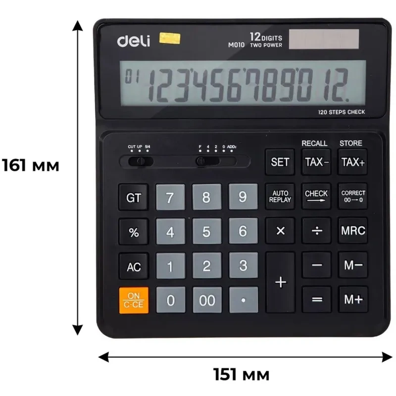 Бухгалтерский калькулятор Deli EM01020 в черном корпусе. Имеет стильный, современный внешний вид. Функция вычисления налога. Популярен как среди бухгалтеров, так и среди продавцов, банковских и офисных сотрудников. Изготовлен из противоударного пластика и отличается большим дисплеем с увеличенными символами для комфортной работы. Позволяет корректировать введенное число, задавать настройки округления и количества знаков после запятой. Калькулятор имеет оптимальный набор вычислительных функций. Разрядность дисплея:12-разрядный . Размер калькулятора: 161×151×34 мм.