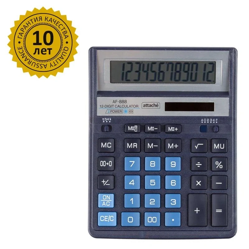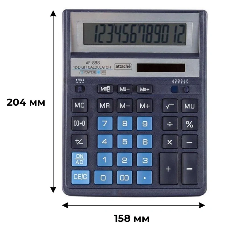 Калькулятор настольный ПОЛН.Attache AF-888,12р,дв.пит,204x158мм, темно-син Калькулятор Attache AF-888 настольный в пластиковом корпусе темно-синего цвета с 12-разрядным ЖК-дисплеем. Имеет оптимальный набор вычислительных функций: основные математические операции, расчет процентов, расчет наценки, извлечение квадратного корня, запоминание промежуточных результатов. Калькулятор имеет функцию автоматического отключения питания. Удобная клавиатура снабжена кнопкой ввода двойного нуля. В калькуляторе имеется два источника питания: солнечная батарея и батарейка G10 (не подлежит замене), а так же есть место для установки батареи AA (не входит в комплект). Совместимые батарейки находятся в разделе ?Расходные материалы?. Размер корпуса: 204x158x38 мм. Размер дисплея: 111x24 мм. Материал кнопок клавиатуры: пластик. Перед использованием внимательно ознакомьтесь с инструкцией. Обращаем внимание, что батарейка не входит в комплектацию данного калькулятора. Cовместимые батарейки находятся в разделе ?Расходные материалы?. Перед применением необходимо снять защитную пленку с металлической панели. Внешний вид и/или характеристики товара могут быть изменены производителем в соответствии с производственным процессом.