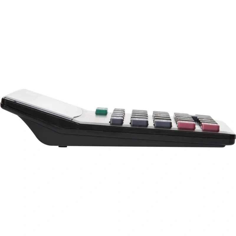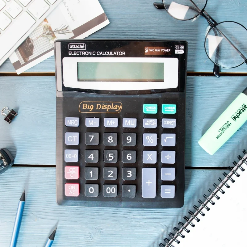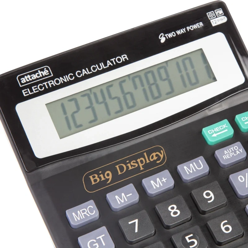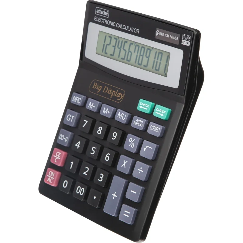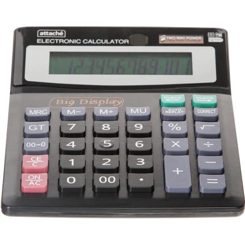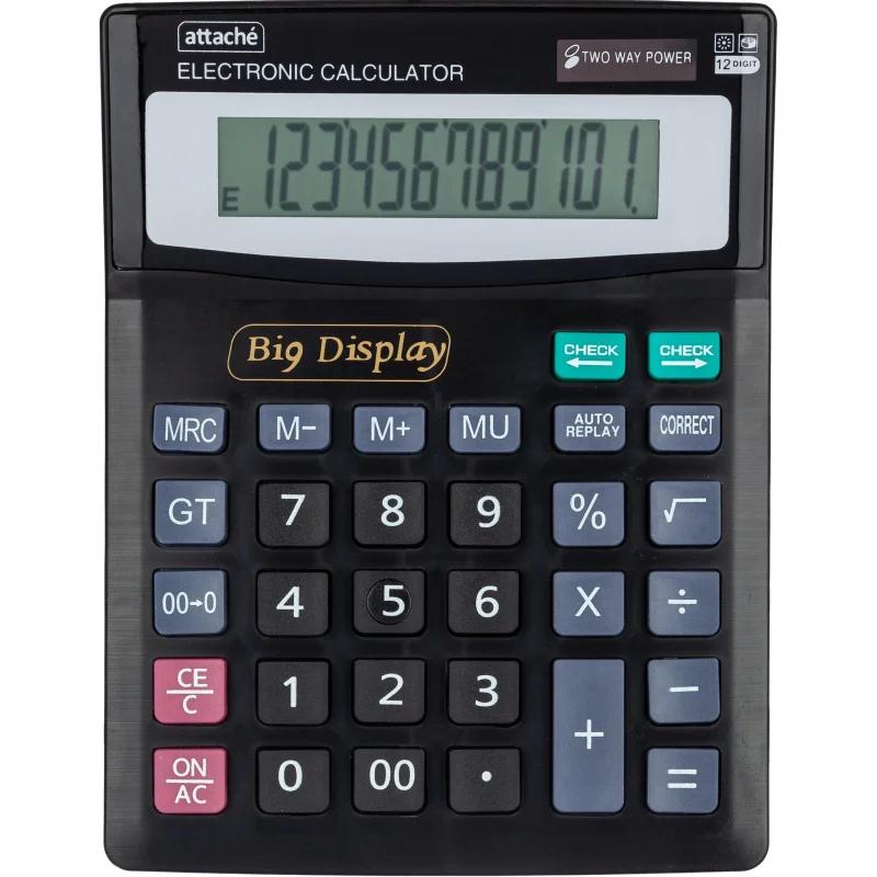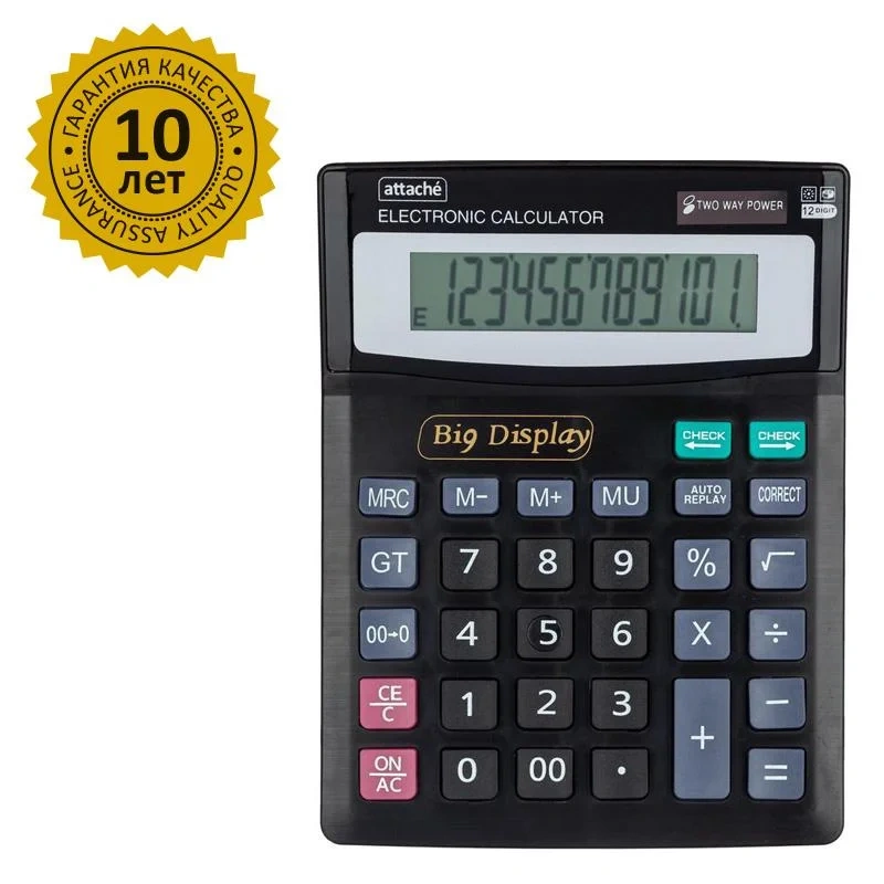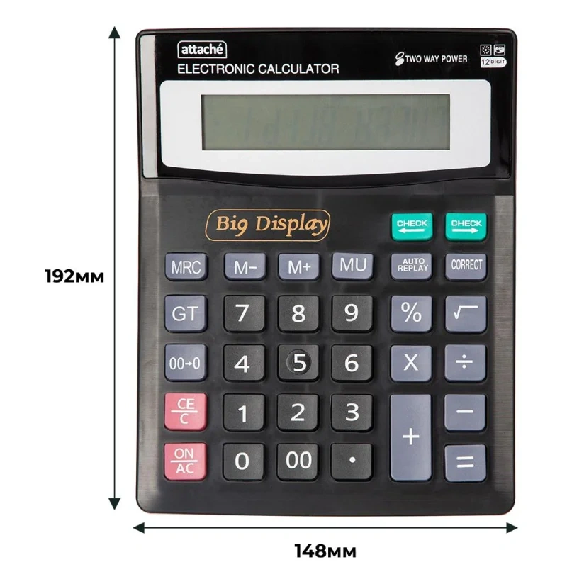 Калькулятор настольный ПОЛНОРАЗ-Й Attache ATC-444-12F12раз.дв.пит,192x148мм Калькулятор Attache ATC-444-12F настольный в пластиковом корпусе с 12-разрядным ЖК-дисплеем. Имеет оптимальный набор вычислительных функций: основные математические операции, расчет процентов, извлечение квадратного корня, запоминание промежуточных результатов. Удобная клавиатура снабжена кнопкой ввода двойного нуля. В калькуляторе имеется два источника питания: солнечная батарея и батарейка AA. Размер: 192x148x33 мм. Тип клавиатуры: пластик. Наличие металлической панели: нет. Обращаем внимание, что батарейка не входит в комплектацию данного калькулятора. Совместимые батарейки находятся в разделе 'Расходные материалы'. Товар относится к ценовому сегменту 'суперэконом'. Имеет упрощенные характеристики и более простую упаковку. Отвечает основным требованиям потребления. Внимание! После вскрытия упаковки для активации солнечной батареи рекомендуем положить калькулятор в освещаемое естественным или искусственным светом место под непрямые лучи освещения. Срок зарядки солнечной батарее зависит от типа освещения. После активации солнечной батареи калькулятор готов к работе. Клавиши, отвечающие за проверку и коррекцию операций: CHECK со стрелкой вправо/влево или стрелки вверх/вниз - пролистывание произведенных операции на индикаторе, AUTO ?REPLA??Y? - включение режима автоматического просмотра операций, CORRECT - изменение чисел или команд в регистре вычислений.